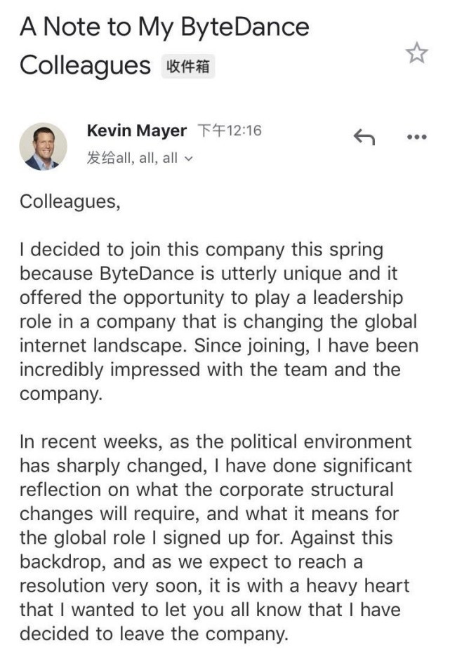 - 3字节跳动商谈出售TikTok业务的过程中,并未让TikTok首席执行官凯文·梅耶尔参与其中,因此他选择了离职。