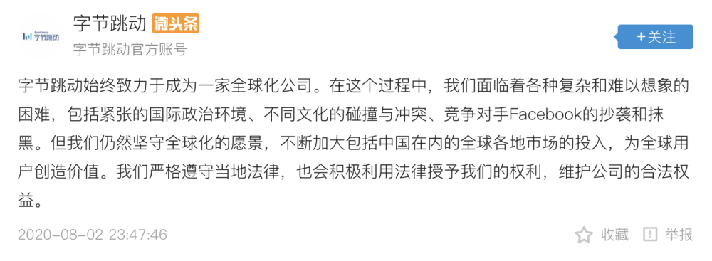 “安全”说辞站不住脚 “这当然不是特朗普个人的一厢情愿,从扎克伯格近期“中国窃取美国技术”的言论来看,“限制中国企业发展”的思维从美国官方到民间都是有一些市场。”丁道师说道,从对华为、大疆、海康威视乃至这次针对TikTok的限制,都是其一脉相承的举措。 与此同时,“TikTok此刻成为了美国文化的一个聚集场地,而且具有了影响美国文化和年轻人群价值观的可能。”互联网产业分析师张书乐向《科创板日报》记者指出,TikTok在美国市场“太耀眼了”,成为了引领美国文化潮流的“旗手”,从而被美国严防死守。 不过,美国政府封禁TikTok的理由,解释为“担心软件会窃取美国公民的信息,有损美国国家安全利益”。对此上述专家均表示不认同。 张笑容表示,国家安全危险拿不出相关的证据。“TikTok 已经做了相当的本地化运营,不但聘请当地美国人负责公司,而且服务器、数据均留在美国,跟中国并无共享。美国人的这种做法,基于爱国者法案,即政府可以无证据调查受怀疑对象,但违背了商业诚信原则和WTO原则。” 张笑容进一步补充道,美国人对隐私看重,隐私问题也是美国人维护自身权益批评互联网巨头的常见理由。“TikTok的确涉及到了用户隐私的收集,这一点是与算法相关,并无涉及国家安全问题的证据”。 营收以及估值影响 有数据指出,2020年1月份,抖音及TikTok收入总计2860万美元,其中美国市场所占的比例为10.1%,仅次于中国。 “如果没有禁止,之后tiktok应该进入一个稳定期,消化和黏住上半年吸纳的庞大用户群,而不是狂飙突进。并且需要从巨大流量找到变现途径。”张书乐分析道。 TikTok 以39种语言在全球150多个市场上提供。印度市场、美国市场,分别是TikTok第一大、第二大市场。印度政府此前也宣布封禁包括TikTok在内的59种中国应用。 据Sensor Tower数据,截至6月30日的初步估计和预测显示,到2020年上半年,全球消费者在苹果App Store和Google Play上总共花费了501亿美元。其中TikTok以4.21亿美元收入名列全球第三,仅次于Tinder与YouTube。仅在2020年上半年,TikTok的安装量就达到6.26亿次。TikTok已经是下载量排名第一非游戏应用。 TikTok全球下载量最新突破20亿次。虽然对于字节跳动千亿级别的营收,TikTok不到百亿的营收占比较低,但是其全球市场背后,是庞大的海外用户,极高的用户活跃度、用户粘性,以及年轻群体高渗透率。流量红利期高增长的TikTok,是其超千亿估值的重要支撑。 “字节跳动的国外收入已经受到严重影响了,今年的计划必然受到冲击。”而且,“倘若TikTok被美国封杀,将会在西方国家引起一系列反应,美国盟友也会陆续封杀或者限制TikTok,这意味着TikTok估值大幅下降,估计缩水一半以上。字节跳动的估值也会因此受到一定影响。” 2020年营收目标1800亿-2000亿元,相比去去年1300亿的营收,增长幅度高达42.5%。张书乐认为,抖音国际版目前还不赚钱,字节跳动的营收目标并不受TikTok的影响。“对于抖音来说,全球化战略还在继续,尽管失去美国及其相关市场,会让其全球化战略受阻,但全球并不仅限于美国市场一地。”虽然估值可能会被影响,但字节跳动本身不是靠估值活着的独角兽公司。” 丁道师认为,从长期来看,此次事件积极的一面是赢得了“声誉”,对未来发展和影响力的提升很有帮助。“某种程度上也是做了一次全球公关,向全世界证明的Tiktok的影响力,以及字节跳动拥有产生爆款产品的能力,所以从长远来说,对未来估值负面影响相对有限。” “类似雅虎日本”,丁道师认为,TikTok经此一役,虽然不会就此消亡,但将来一个总的发展策略就是让各国共享发展红利,变成业务所在国的本土化企业。 出海企业的集体危机? 业内人士提醒,中国出海应用将受到极大挑战。 “这个现象被称为splinternet,互联网割据,指的是互联网是分散的,由单独的法规支配并由不同的服务运行。互联网割据凶涛恶浪来了,已经不是一个企业遇到的问题,而是整个互联网行业面临的挑战。”张笑容认为,相关企业,不仅要凭借自身实力出海,还要学会选择符合自己价值观的市场,及早调整自身发展战略。 “美国的强大,来自于秉承开放包容的心态,得益于全球资源的汇集。美方近期一系列的举措,都在说明要的通过人为的行政干预,把开放共享的互联网变成美方可以掌控的局域网。一旦科技领域的创新者疏远美国,最终将搬起石头砸自己的脚。而全球互联网如果变成各方割据的局域网的趋势无法得到阻止,将是一次历史倒退。”丁道师如是称。 对于出海企业,丁道师认为,第一,在每一个市场要学会和当地利益共享,进行本土化运营。如在当地成立分公司或者办事处,创造税收,解决当地的就业问题,变成一家所在国家本土化的企业。第二,实际运行中,要符合当地所在国家的法律法规。 张书乐则表示,不同市场区域发生变化,但全球化的脚步不会停,出海企业要改变布局方式。