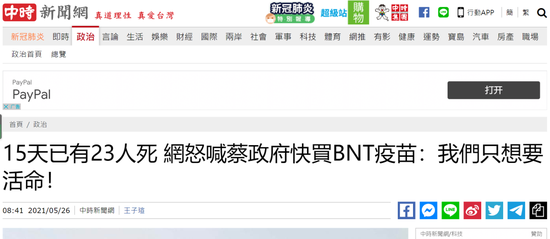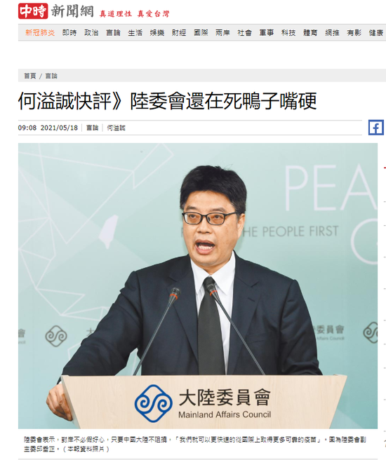 防疫不力甩锅大陆 大陆方面一直表示愿意向台湾伸出援手,提供疫苗。大陆国台办发言人朱凤莲日前表示,近期台湾疫情日趋严峻,广大台胞急切期盼使用大陆疫苗,当务之急是去除岛内人为的政治障碍。18日,金门县长杨镇浯向当局喊话,呼吁同意金门县从大陆取得国际认可的合法疫苗。医生出身的台置连江县长刘增应称,为了乡亲们的健康,盼当局慎重考虑,无论是大陆还是其他地区的疫苗。但台湾陆委会面对大陆善意竟称,“对岸不必假好心,只要大陆不阻挠,我们就可以更快速地从国际上取得更多可靠的疫苗”。 国民党前民意代表蔡正元痛批,自己生不出小孩,却怪隔壁邻居不帮忙,“怎么会有这么不要脸的人”。而把买不到疫苗的责任怪罪大陆阻挠,又是本年度最烂的笑话。他说,凡事甩锅给大陆,现在才发现医疗资源样样缺,什么都没有准备,只会开记者会报数字,“这招甩锅大陆如果还有效,那真的是没有药救了”。中时电子报称,大陆有灭活、重组蛋白等5款疫苗,打了超过4亿人次也没出大毛病和大纰漏,两岸同胞同源同种,适用性应该比针对白种人研制的疫苗更高,陈时中有种倒是挑明大陆阻挠台湾购得境外疫苗的证据,掩饰表明肯定有见不得人的猫腻。 不仅如此,民进党当局还倒打一耙,声称大陆对台进行“认知作战”,干扰台湾抗疫。蔡英文20日视察台军防疫工作时称,最近有很多“扰乱民心士气、别有用心的假信息”出现,比如化学兵“消毒药剂非常毒”,引起民众紧张,“这是认知作战,也是压力测试,我要请各位务必提高警觉,妥善因应”。24日下午,民进党民意代表王定宇声称,“PTT鼓吹移除或封锁疾管家是中国认知作战”,威胁说此举已经违反“国安法”,最重可判7年以上有期徒刑,并科罚金最高1亿元新台币(约合2300万元人民币)。PTT八卦版网民对此非常不满,人肉搜索始作俑者后发现,发帖攻击民进党、谩骂蔡英文的“认知作战”,一切都是绿营写手林玮丰的“自导自演”,而他的老婆正是民进党网络中心副主任。林玮丰被网民“抓现行”,不得不两度公开道歉。前“立委”孙大千嘲讽说,可惜的是绿营政客和侧翼打手们太低估PTT版主和网民的智慧,最后自取其辱,功亏一篑。