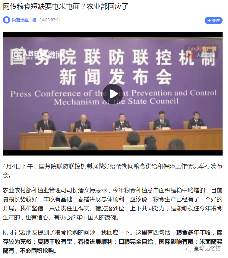今天是第40个世界粮食日,也是联合国粮食及农业组织(粮农组织)成立第75周年。今年粮食日的主题是“齐成长、同繁荣、共持续,行动造就未来。”全国粮食安全宣传周的主题是:“端牢中国饭碗 共筑全球粮安”。 自从疫情打击了全球农业市场,全球各国开始轮番上演屯粮狂潮; 目前,约旦增加了17个月的小麦储备并创下历史记录,全世界最大的粮食购买国之一埃及自4月以来把粮食购买量提高了51%,摩洛哥也将在2020年剩余时间内免税进口小麦,巴基斯坦也在增加小麦和糖的采购; 这一切的迹象都在表明,各国都在努力屯粮,以避免疫情破坏贸易并切断农产品供应链; 而在更多国家,其国内的商家和消费者们也在改变库存管理策略,并从激进转向保守。美国银行的分析师表示,消费者希望持有更多库存,以防未来的粮食供应中断! 4月4日下午,国务院联防联控机制就做好疫情期间粮食供给和保障工作情况举行发布会。 农业农村部种植业管理司司长潘文博表示,今年粮食种植意向面积是稳中略增的,目前夏粮长势较好,丰收有基础,春播进展总体顺利,应该说,粮食生产已经有了一个好的开局。我们坚信,只要责任压得实、措施落到位,上下共同努力,是能够稳住今年粮食生产的,也有信心、有决心端牢中国人的饭碗。 刚才记者朋友提到了粮食抢购的问题,我回应一下。这里有四句话,粮食多年丰收,库存较为充裕;夏粮丰收有望,春播进展顺利;口粮完全自给,国际影响有限;米面随买随有,不必囤积抢购。 来源:人民日报
