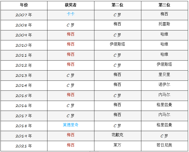 新京报讯(记者 徐邦印)11月30日,2021年金球奖悬念揭晓,梅西力压莱万、若日尼奥,职业生涯第7次获奖。C罗位列梅西、莱万、若日尼奥、本泽马、坎特之后,仅排名第6,2010年后首次跌出金球奖前3。 C罗并未现身今晨的颁奖典礼,而是在社交媒体上发表了一篇长文,驳斥《法国足球》杂志主编费雷的“谎言”。“费雷称我唯一的目标是,退役时的金球奖数量超过梅西,这是谎言。”C罗强调,他职业生涯的最大抱负是代表俱乐部、国家队赢得大赛冠军,成为所有职业球员以及有志踏上职业赛场的人的榜样,“我的注意力已经集中在曼联的下场比赛中。” 自2007年以来,过去15年总计14次评选出金球奖,梅西13次入围前3,7次获奖,C罗12次入围前3,5次获奖,两人曾多次同时出席颁奖典礼,并在台下祝贺对方获奖。C罗说,他从来不会和任何人对立,总是在体育精神、公平竞争的角度恭喜所有的获奖者。 当然,场外的不和谐声音并不会抹去“梅罗”过去十几年对金球奖的垄断,“绝代双骄”的你追我赶已然成为金球奖历史最美好的记忆。 2007年,率领AC米兰获得欧冠冠军的卡卡捧起金球奖奖杯,那年的C罗只有22岁,梅西年仅20岁,两人同时入围金球奖前3,绝代双骄的竞争由此开始。 2008年至2017年,C罗、梅西包揽了全部10座金球奖。梅西始终位列前3,并在2009年至2012年连续4年获奖。C罗9次入围金球奖前3,只在2010年被梅西、伊涅斯塔、哈维挤出前3。那10年是“梅罗”的巅峰期,两人分别5次斩获金球,平分秋色。