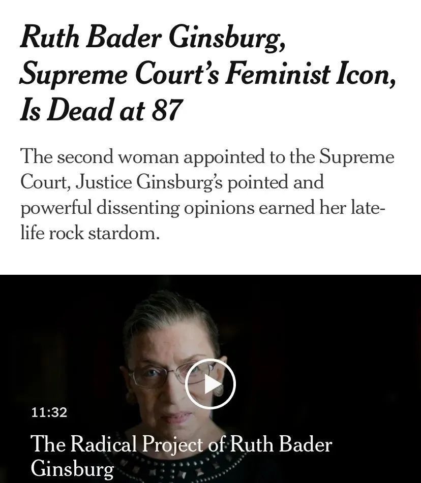 不只为女性发声 在学校任教期间,金斯伯格加入美国公民自由联盟(ACLU),并于1973年成为联盟的总法律顾问。 金斯伯格开始在一系列为女性权利辩护的案件中大展身手。包括美国历史上具有里程碑式意义的《弗朗蒂罗诉理查森案》,这是美国最高法院第一次将美国宪法第十四修正案平等保护条款推及到妇女权益保障的案例。 1973年,女少尉弗朗蒂罗发现她的男同事们都有住房津贴,只有她没有。她向上级提出异议时,却被告之:“女人能参军就是三生有幸了。空军能接纳你来服役,你应该感到荣耀。” 面对当时的社会偏见“好女孩不会去法院”,弗朗蒂罗还是提出诉讼,并找到金斯伯格为其辩护。 在地方法院败诉后,金斯伯格一个一个字润色辩护状,梳理女性面临的困难,继续上诉到了最高法院,并最终以8:1的投票结果,取得了胜诉。 这一案件中,金斯伯格学会了一个重要工作准则:“人不可能一下子就接受一个观念。社会变革需要逐步累积、循序渐进。真正可持续的改变需要一步一个脚印才会发生。” 金斯伯格不只为女性发声,还为每一个因性别歧视而受到伤害的人发声。 1975年对于斯蒂芬·维森菲尔德来说,是充满波折的一年。在妻子难产离世后,这位父亲选择了全职在家照顾孩子,却因为不是母亲,而领不到单亲家长保障金。金斯伯格接了这个案子,为其辩护,最终取得了胜诉。 “我认为,男人和女人会并肩合作把这个世界变得更美好,”金斯伯格说,“不是女性解放,而是所有人解放。” 1980年,卡特总统上台,金斯伯格被任命为美国哥伦比亚特区联邦巡回上诉法院法官。1993年,大法官的位置终于有了一个空缺。当时的总统克林顿见了金斯伯格十分钟,就确定她为最终提名人选。 “声名狼藉” 作为民主党总统提名的大法官,金斯伯格长期维持着与保守派大法官的平衡。近年来,在美国社会趋于保守的形势下,她在一些最具争议的社会议题上,用投票表达了自己的观点,包括堕胎权、同性婚姻、投票权、移民、医保和平权行动。2013年,她还成为第一位为同性伴侣主持婚礼的大法官。 虽然金斯伯格在坚持性别平等方面的立场得到了绝大多数人的支持,但她对堕胎和同性婚姻的支持,却饱受美国国内保守主义者的批评。 这些批评声没有阻碍金斯伯格更频繁、更坚定地提出异议。 即使是在5次罹患癌症后,金斯伯格也依然保持着在国内外频繁露面。她在1999年患结肠癌,2010年患胰腺癌,2018年患肺癌,2019年又患胰腺癌,2020年因胰腺癌复发患肝脏病变。在此期间,她经历了多次化疗和放疗,但如斗士一般,始终沉着冷静,瘦小的身体里包裹着坚强的意志与勇气。2009年,在癌症大手术后的三个星期,她甚至还出席了国情咨文演说。 金斯伯格坚定果断的风格,也吸引了越来越多年轻一代的注意。由于总在最高法院判决时发出愤怒的异议,金斯伯格被粉丝们亲切地称为“声名狼藉”的金斯伯格。美国著名说唱歌手克里斯托弗·华莱士亦被称为“声名狼藉先生”。声名狼藉虽是贬义词,但在此想要形容的,却是一种直击人心的影响力。 美国前总统吉米·卡特称金斯伯格是一位“真正伟大的女性”。他写道:“她拥有强大的法律头脑,是性别平等的坚定倡导者,在她漫长而非凡的职业生涯中,她一直是正义的灯塔。”
