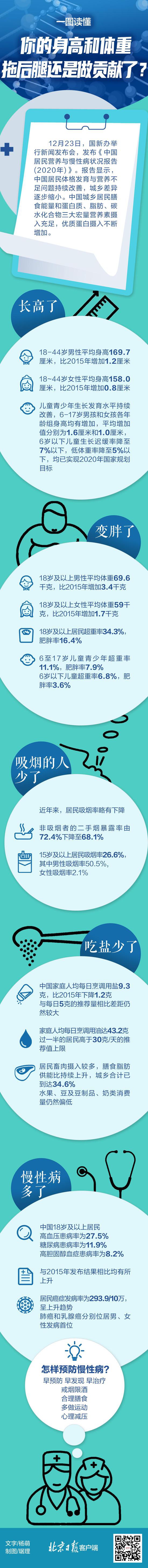 12月23日,国务院新闻办举行新闻发布会,国家卫生健康委副主任李斌介绍《中国居民营养与慢性病状况报告(2020)年》有关情况,并答记者问。 李斌表示,我国居民营养状况持续改善,主要体现在三个方面。 一是居民的平均身高持续增长。我国18-44岁的男性和女性平均身高分别为169.7厘米和158厘米,与2015年相比分别增加1.2厘米和0.8厘米。6-17岁的男孩和女孩各年龄组身高平均分别增加了1.6厘米和1厘米。 二是营养不足的问题得到持续改善。6岁以下儿童生长迟缓率降至了7%以下,低体重率降至5%以下,均已实现2020年国家规划目标。特别值得一提的是,我国农村儿童的生长迟缓问题得到了根本改善,农村6岁以下儿童生长迟缓率由2015年的11.3%降至5.8%;6-17岁儿童青少年生长迟缓率从4.7%降到了2.2%。 三是人群微量营养素缺乏症也得到了持续改善。以贫血为例,本次监测的结果显示,我国18岁及以上居民贫血率为8.7%,6-17岁儿童青少年贫血率为6.1%,孕妇贫血率为13.6%,与2015年发布的结果相比均有显著下降。 此外,我国居民还有一些突出的营养问题,主要体现在三个方面。 一是膳食结构不合理的问题突出,膳食脂肪供能比持续上升,食用油、食用盐摄入量远高于推荐值,而水果、豆及豆制品、奶类消费量不足。 二是我国居民超重肥胖的形势严峻,城乡各年龄段居民超重肥胖率持续上升。 三是部分重点地区、重点人群,如婴幼儿、育龄妇女和高龄老年人面临的重要微量营养素缺乏等问题仍需要引起关注。 李斌表示,针对居民这些仍然存在的营养问题,下一步,将推进实施健康中国合理膳食行动和国民营养计划,该计划从2017年到2030年进行了规划,以一个行动、一个计划为抓手,采取有效措施来积极应对。