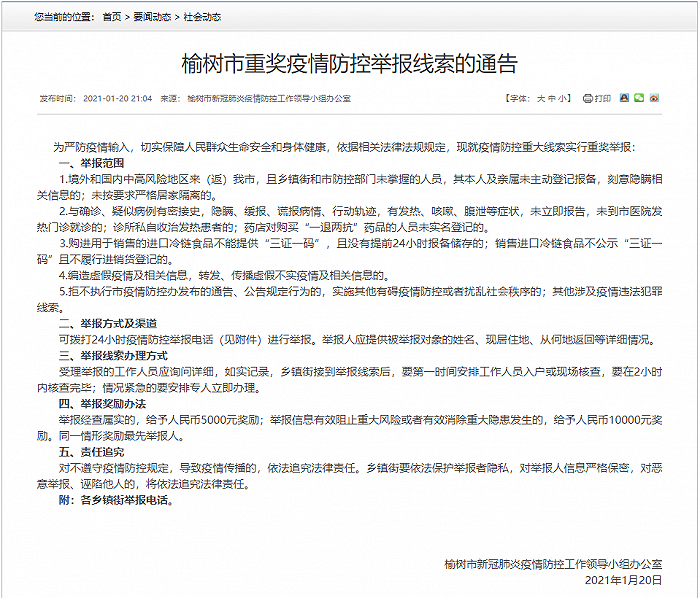 1月20日,榆树市人民政府官网消息,榆树市新冠肺炎疫情防控工作领导小组办公室发布《重奖疫情防控举报线索的通告》,通告明确,举报经查属实的,给予人民币5000元奖励;举报信息有效阻止重大风险或者有效消除重大隐患发生的,给予人民币10000元奖励。同一情形奖励最先举报人。 附原文: 为严防疫情输入,切实保障人民群众生命安全和身体健康,依据相关法律法规规定,现就疫情防控重大线索实行重奖举报: 1。境外和国内中高风险地区来(返)榆树市,且乡镇街和市防控部门未掌握的人员,其本人及亲属未主动登记报备,刻意隐瞒相关信息的;未按要求严格居家隔离的。 2。与确诊、疑似病例有密接史,隐瞒、缓报、谎报病情、行动轨迹,有发热、咳嗽、腹泄等症状,未立即报告,未到市医院发热门诊就诊的;诊所私自收治发热患者的;药店对购买“一退两抗”药品的人员未实名登记的。 3。购进用于销售的进口冷链食品不能提供“三证一码”,且没有提前24小时报备储存的;销售进口冷链食品不公示“三证一码”且不履行进销货登记的。 4。编造虚假疫情及相关信息,转发、传播虚假不实疫情及相关信息的。 5。拒不执行市疫情防控办发布的通告、公告规定行为的,实施其他有碍疫情防控或者扰乱社会秩序的;其他涉及疫情违法犯罪线索。 可拨打24小时疫情防控举报电话(见附件)进行举报。举报人应提供被举报对象的姓名、现居住地、从何地返回等详细情况。 受理举报的工作人员应询问详细,如实记录,乡镇街接到举报线索后,要第一时间安排工作人员入户或现场核查,要在2小时内核查完毕;情况紧急的要安排专人立即办理。 举报经查属实的,给予人民币5000元奖励;举报信息有效阻止重大风险或者有效消除重大隐患发生的,给予人民币10000元奖励。同一情形奖励最先举报人。