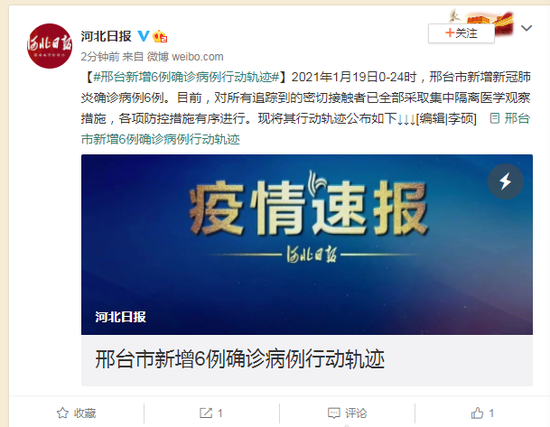 确诊病例12:女,69岁,藁城区增村镇小果庄村人,为1月15日第35号确诊病例的婆婆。2021年1月2日至10日居村无外出,期间2日、4日、5日、7日4次核酸检测均为阴性;1月11日转运至藁城区指定隔离点进行集中隔离医学观察;期间12日、14日、15日、16日4次核酸检测均为阴性;1月19日核酸检测呈阳性,当日由120负压救护车转运至石家庄市人民医院建华院区,诊断确诊病例。 确诊病例13:女,20岁,现住长安区普和小区北院旁边的平房宿舍。2021年1月1日早上步行到市区某单位上班,中午到单位附近小老头板面吃饭,晚上到单位附近的小龙坎火锅店就餐,19时30分乘坐112路公交车回宿舍;1月2日步行上下班,中午骑自行车回宿舍休息;1月3日至4日在居住处无外出;1月5日上午步行上班,12时到北国超市(益庄店)购物,再到附近华莱士汉堡店购物后回宿舍,下午到普和小区快递柜取快递;1月6日上午在居住处无外出,下午步行到北国超市(益庄店)购物;1月7日至10日上午在居住处无外出;1月10日下午至18日,每天早8时上班,晚上21时左右下班回宿舍,期间14日14时30分到单位附近神威大药房购药,1月11日、16日2次核酸检测均为阴性;1月18日核酸检测呈阳性,由120负压救护车转运至河北省胸科医院,1月19日诊断为确诊病例。