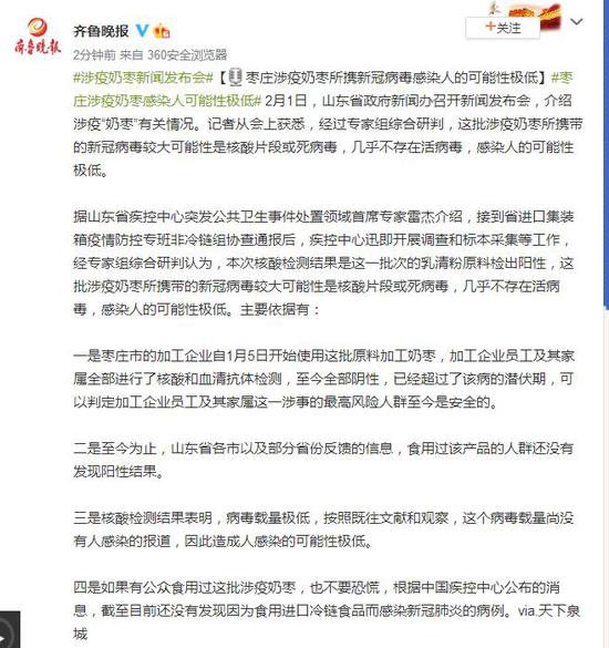 原标题:涉疫奶枣已销往25省份,有人收货当天吃完 据“揭阳发布”2月1日消息,广东揭阳普宁市高埔镇新冠肺炎疫情防控办1月30日作出《关于“涉疫奶枣经线上渠道流入高埔镇”核查情况的通报》称,1月29日晚,高埔镇接上级通知,山东省枣庄市一批作为生产奶枣原料的进口乳清粉核酸检测结果为阳性,部分奶枣产品通过线上渠道流入市场,其中高埔镇涉及订单1个。高埔镇新冠肺炎疫情防控工作领导小组高度重视,立即启动应急处置。 经核查,该订单于1月16日下午从山东省枣庄市峰城区通过某快递发出,21日到达高埔镇快递代收点。高埔镇防控人员立即对该快递代收点应急临时关闭,进行排查消毒,并对收件人住处进行现场核查。 经核查,该订单奶枣数量约20颗、重量约0.5kg。收件人21日收到该订单后,于当日与其家人分食完。镇防控人员对收件人一家4人和快递代收点工作人员4人采集核酸并送往市权威机构检测,核酸检测结果均为阴性。 山东枣庄涉疫奶枣销往25省份