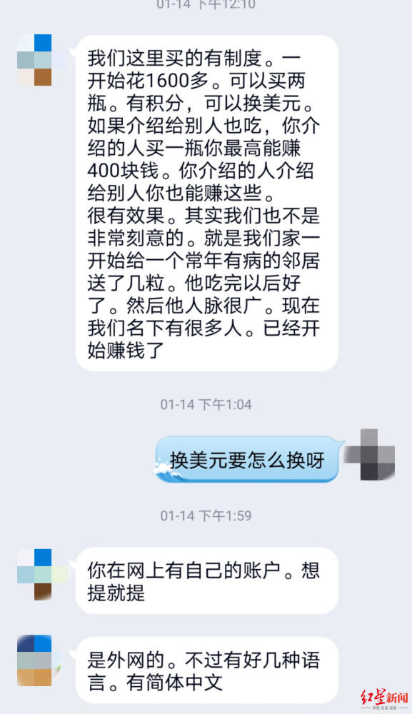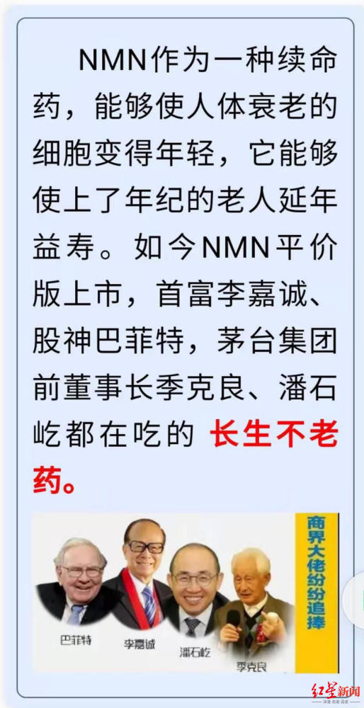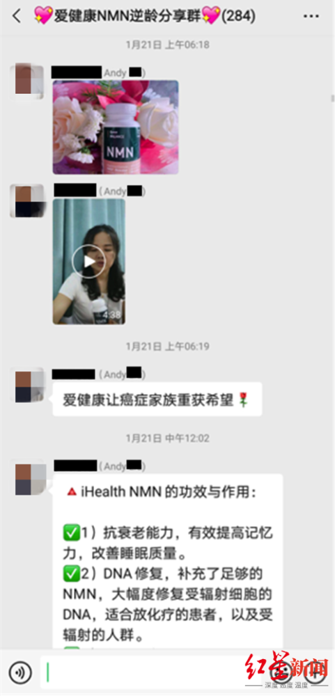 家中老人老年性湿疹久治不愈,胳膊上的红紫色斑纹扩散到全身,瘙痒难耐,于大洋母亲“有病乱投医”,购买了4瓶“长寿药”,一瓶30粒,售价870元。 这一试,全家人就此“入坑”。仅仅服用了几个月时间,全家人对NMN已经“顶礼膜拜”。于大洋母亲说,“长生不老”看不出来,但绝对能提升寿命;于大洋自己则说,这“药”能够让细胞返回年轻状态,达到逆龄效果。 说这话的时候,于大洋既是NMN的消费者,也试图通过NMN致富。一个多月前,本打算当保安的他成为iHealth(爱健康)品牌NMN产品的线上代理商。 根据南方周末报道,曾被保健品行业使用过的“直销”手段,正被套用在NMN相关产品上。红星新闻记者对多名NMN代理商的采访,亦印证了这一点。 2020年2月,Jessie在iHealth官网注册成为会员,目前,她已经推荐1400人成为爱健康公司的会员。 Jessie称:“iHealth的NMN原料产地在美国和德国,且获得了专利认证;公司由创投基金公司投资创立,由爱健康公司做运营管理。” 当红星新闻记者以消费者身份询问相关专利认证信息时,Jessie称,在美国有很多东西是保密的,专利信息公司是不对外公开的,包括“医药厂”的信息也是保密的。 三个月前,Jessie将iHealth品牌NMN推荐给Andy服用。随后不久,Andy组建了微信群,销售该品牌NMN。 Andy说:“我要用毕生的精力传播它。”
