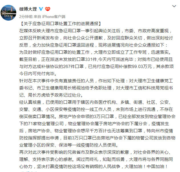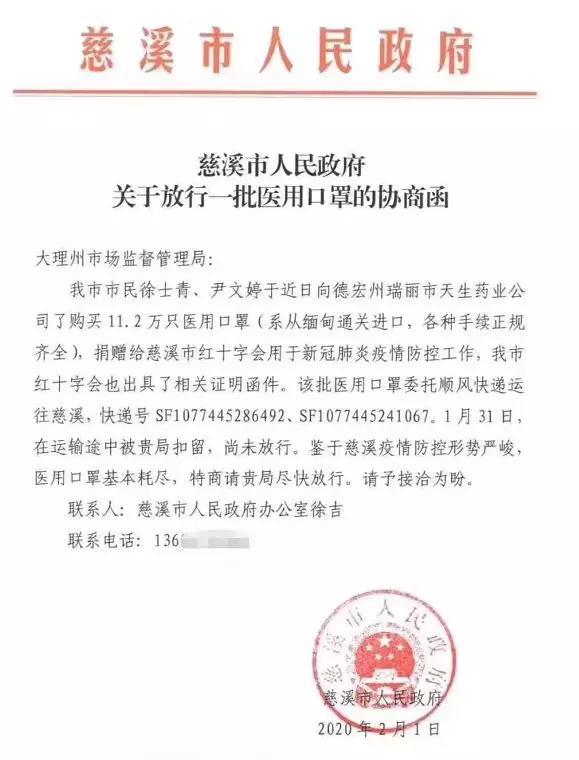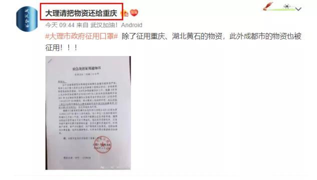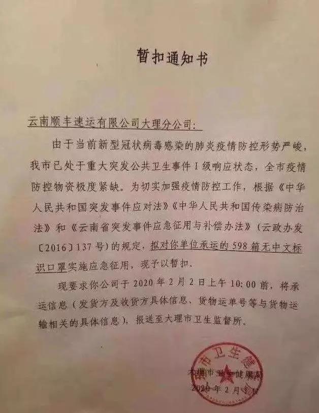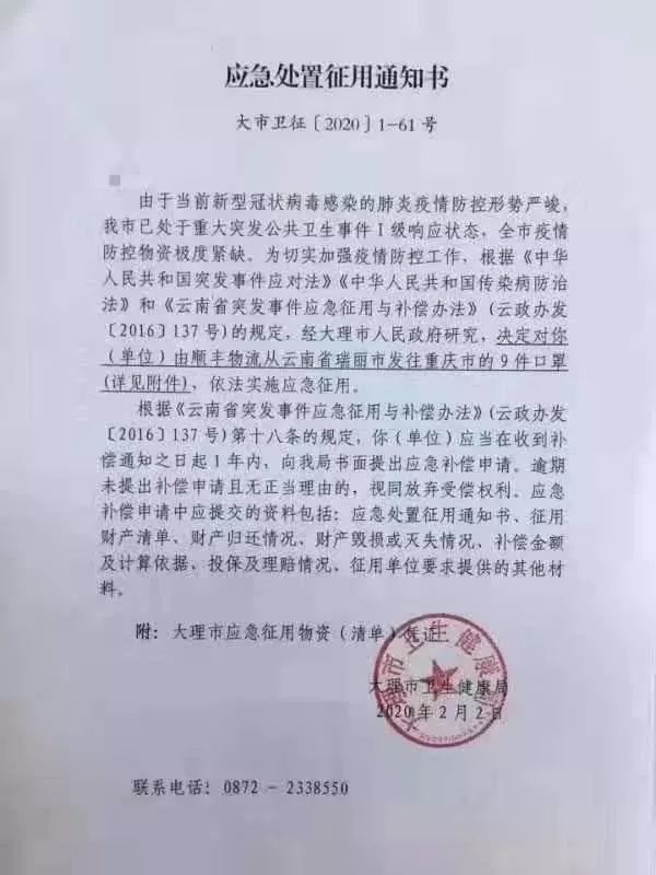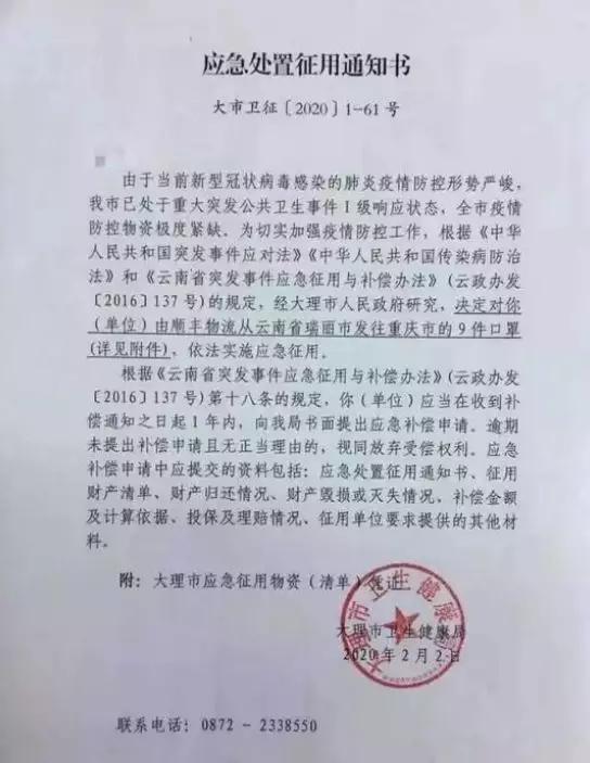 实际上,这批物资(口罩)是重庆新型冠状病毒感染的肺炎疫情防控工作领导小组(下称“重庆新冠肺炎疫情防控小组”)委托企业采购的。 一封落款为2月3日,由重庆新冠肺炎疫情防控小组发给大理市卫生健康局的《关于商请放行暂扣物资的函》显示,重庆方面在大理市扣下这批物资后曾发函索要,但由于口罩已经分发使用,无法追回。 重庆发出的《关于商请放行暂扣物资的函》全文如下: 大理市卫生健康局: 我市委托供应商购买的一批口罩,委托云南顺丰速运有限公司大理分公司承运2月1日被贵单位暂扣(附9件快递单号)。该批物资系重庆市新型冠状病毒感染的肺炎疫情防控工作领导小组指定企业采购用于重庆市疫情防控的紧急物资,现恳请贵单位予以放行。 重庆市新型冠状病毒感染的肺炎疫情防控工作领导小组 综合办公室医疗物资保障组(代章) 2020年2月3日 2月5日中午,经济观察网记者致电大理卫生健康局方面(征用通知书上所留联系方式),对方表示确有此事,这批物资已经被应急征用,并由工作组发放到下面。 记者又向其询问是否收到重庆方面的索要函,对方表示知晓,但物资(口罩)已经发放无法追回,索要物资需要同工作组商量以及同卖家(发货方)协调。 经济观察网未能联系上重庆新冠肺炎疫情防控小组对抗肺炎疫情物资在运输途中被截一事作出置评。 抗肺炎物资在运输途中被应急征用的事件非常罕见,但也反映出全国各地区口罩物资紧缺的局面。 经济观察网记者将继续追踪报道此事件。