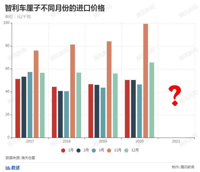 最近很多媒体都在说“车厘子价格腰斩”,且相较于往年价格也普遍便宜了不少。 从海关进口单价来看,2020年12月份的价格(65.54元/千克)相较11月份(99.21元/千克)确实下跌了34%。但是2020年12月份全月的平均进口价格并没有低于往年,反而更高。从进口的量上来看,2020年12月份进口2.6万吨,而2019年12月份进口了3.6万吨。 从这些数据上看,12月份的车厘子进口量降低了,单价提高了。可车厘子的零售价格反而降了。 所以,可以合理推断,12月后期进口的价格应该明显低于这个平均价格,这个部分等到2021年1月份数据公布的时候我们就可以得到进一步的验证。 此外,可能还有以下原因影响价格: 供大于求 主产区智利每年有90%的车厘子销往中国。2020年智利车厘子丰收,产量增长30%。此外,近几年智利车厘子的种植面积以年均10%的速度增长。在2020-2021年度,种植面积估计将达到42,200公顷。如果这种趋势继续下去,到2023-2024年度,产量很可能超过34.5万吨。 据《北京日报》消息,智利驻华大使馆商务参赞娜塔介绍,2020年至2021年车厘子季将有50万吨智利车厘子进入中国市场。 根据上述我们统计的数据发现,2020年11月-12月份,智利出口到我国的车厘子仅2.9万吨。2021年,可能还会有47万吨的车厘子输入中国,其中1-3月份将会是峰值。而这个进口量已经相当于2020年全年中国车厘子进口总量的2倍之多。 如此来看,2021年的“车厘子自由”恐怕很容易实现,也许真正的降价还在后面。 疫情影响 过去这一年,冷链造成的新冠病毒输入频繁出现。消费者们对于长途冷链过来的车厘子安全性有顾虑,担心沾上新冠病毒。 水果商也担心国内疫情加剧,消费者需求大幅萎缩,抓紧低价出手。别都砸在手里,损失惨重。