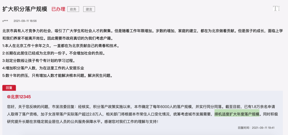 9月11日18时56分,有网民在人民网领导留言板向北京市委书记蔡奇留言,建议“扩大积分落户规模”。 留言中称:北京市是具有人才竞争力的社会,吸引了广大学生和社会人才的聚集。但是随着工作年限增加,岁数的增加,家庭的建立,都在为北京做着贡献。但是孩子的成长,面临上学和我们养家不能离开岗位。因此需要市政府真切地为我们考虑户籍。 该网民表示,其“本人在北京工作十余年之久,一直都在为北京贡献自己的青春和技术。长期在此居住已经成为北京的一分子。不会增加社会的负担。划定分数线让孩子有个有计划的学习过程。增加积分落户人数,为在这里工作的人安居乐业。数十年的挤压,只有增加人数才能解决根本问题,解决民生问题”。 9月11日19时41分,北京12345回复称,“关于您反映的问题,市发改委回复:经核实,积分落户政策实施以来,本市确定了每年6000人的落户规模,并实行同分同落。截至目前,已有1.8万余名申请人取得了落户资格,加子女连带落户实际落户超过2.8万人,相关部门将根据本市常住人口变化情况,统筹考虑城市发展需要,择机适度扩大年度落户规模。同时积极研究提升长期在京稳定就业居住人员的公共服务保障水平。” 新京报记者 沙雪良 徐美慧 编辑 刘梦婕 白爽 校对 李立军