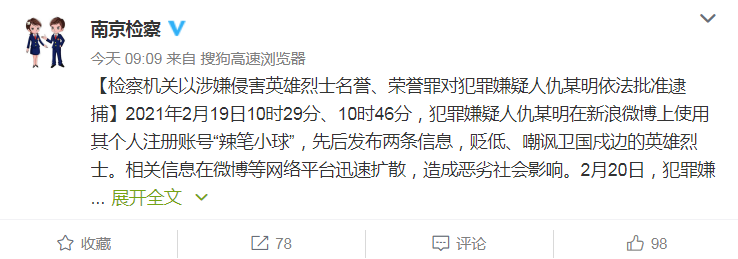 消息称,2月19日10时29分、10时46分,犯罪嫌疑人仇某明在新浪微博上使用其个人注册账号“辣笔小球”,先后发布两条信息,贬低、嘲讽卫国戍边的英雄烈士。相关信息在微博等网络平台迅速扩散,造成恶劣社会影响。2月20日,犯罪嫌疑人仇某明被公安机关刑事拘留,南京市建邺区人民检察院依法介入侦查。2月25日,公安机关以涉嫌寻衅滋事罪提请检察机关批准逮捕。 检察机关审查认为,犯罪嫌疑人仇某明利用信息网络贬低、嘲讽英雄烈士,侵害英雄烈士的名誉、荣誉,社会影响恶劣,情节严重。根据《中华人民共和国刑法》第二百九十九条之一的规定,南京市建邺区人民检察院依法以涉嫌侵害英雄烈士名誉、荣誉罪对犯罪嫌疑人仇某明批准逮捕。 消息称,英雄烈士用鲜血、生命捍卫祖国领土,其名誉、荣誉不容诋毁。《中华人民共和国英雄烈士保护法》《中华人民共和国民法典》明确规定对侵害英雄烈士的名誉、荣誉的行为,要承担相应的民事、行政、刑事责任。 2月27日,最高人民法院、最高人民检察院发布《最高人民法院、最高人民检察院关于执行〈中华人民共和国刑法〉确定罪名的补充规定(七)》,其中明确了“侵害英雄烈士名誉、荣誉罪”、“高空抛物罪”、“冒名顶替罪”、“妨害安全驾驶罪”、“袭警罪”、“催收非法债务罪”、“非法植入基因编辑、克隆胚胎罪”等新罪名,并对一些罪名进行了修改。《补充规定》自3月1日起施行。 南京检察机关表示,根据《中华人民共和国刑法》第十二条第一款的规定,犯罪嫌疑人仇某明触犯了《中华人民共和国刑法修正案(十一)》第三十五条的规定,侵害英雄烈士名誉、荣誉,严重损害卫国戍边英雄烈士的人格尊严,严重损害卫国戍边军人形象,损害社会公共利益,依法应予追诉。同时,为维护英雄烈士的合法权益,在军事检察机关的支持配合下,南京检察机关决定公益诉讼立案并开展调查。 2月20日,南京市公安局发布通报,已于19日将发布违法言论的仇某某(男,38岁,南京人,网名“辣笔小球”)抓获。长安街知事(微信ID:Capitalnews)注意到,该账号是有254万粉丝的微博认证大V。 根据网友此前截图,@辣笔小球 账号在其微博发布内容,诋毁英烈,妄称“阵亡的不仅仅只有4人”,诋毁在边境斗争中身负重伤的团长祁发宝。 有网友指出其身份是《经济观察报》员工。2月19日晚,@经济观察报 官微直接点名了账号所有者仇子明,并声明其早在2015年就已经从经济观察报离职,其言行与经济观察报没有任何关系。 相关报道: 为何认定“辣笔小球”涉嫌的是寻衅滋事罪?原因在这 “辣笔小球”被拘,中纪委:任何抹黑英雄的行为都将付出代价 微博:大V“辣笔小球”诋毁英烈被禁言一年