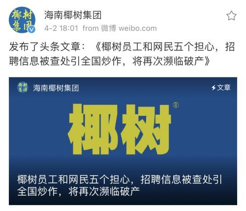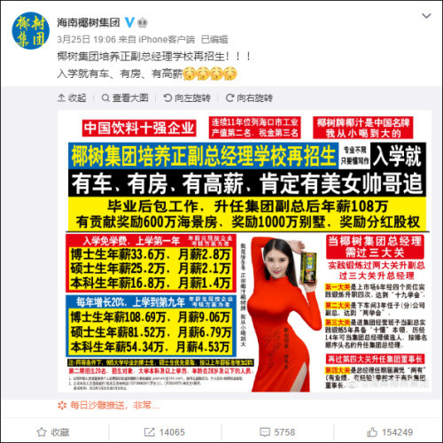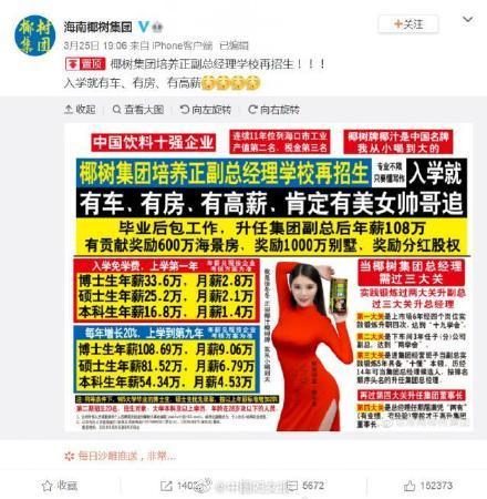 公告还提到,上述虚假报道对公司声誉造成了严重影响,已向相关报道媒体发送《律师函》和《严正声明》,要求立即删除虚假报道,澄清事实,并在媒体上向公司公开道歉。公司将保留进一步追究其法律责任的权利。 3月25日,微博认证为“椰树集团海南椰汁饮料有限公司”在其微博中发布一则广告,广告内容显示:“椰树集团培养正、副总经理学校再招生!!!专业不限只要懂写作,入学就有车、有房、有高薪、肯定有美女帅哥追。”广告发布后,引发了社会争议。 3月31日,海南省市场监管局迅速对椰树集团海南椰汁饮料有限公司(下称“椰树集团”)相关负责人进行行政约谈。椰树集团发布的上述广告内容,违反了《广告法》的相关规定,造成了不良的社会影响,省市场监管局已于近日依法对椰树集团发布涉嫌违法广告的行为进行立案调查。 需要一提的是,上述微博目前已查询不到,微博认证为“椰树集团海南椰汁饮料有限公司”最近一条微博发布时间是2月23日。(中新经纬APP)