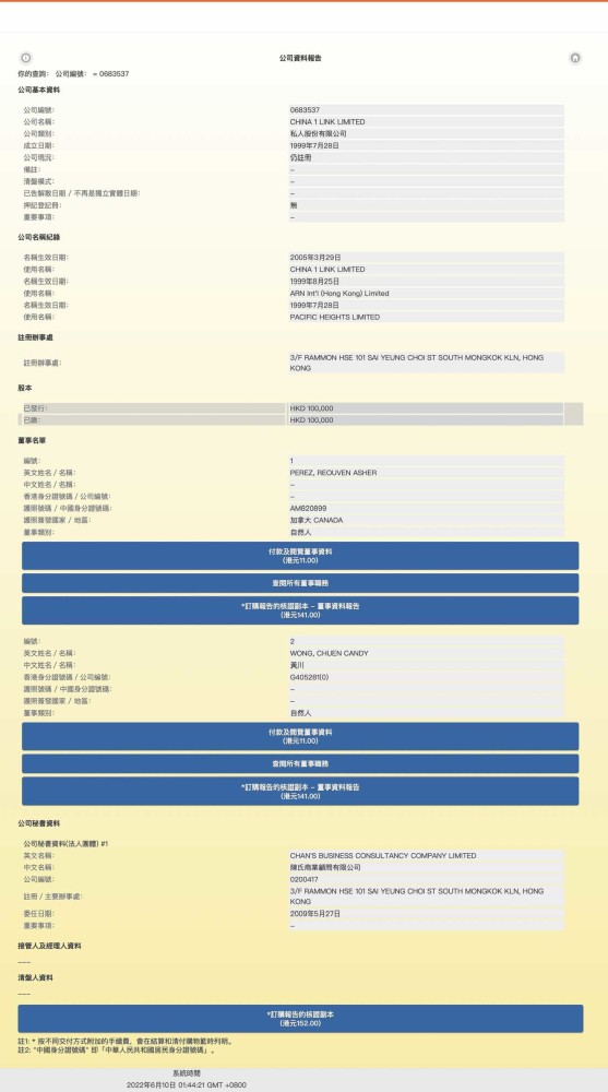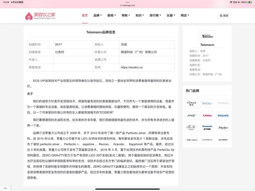 按图索骥,Perfectio X 零重力PX 天猫旗舰店标示的生产企业OMM IMPORTS INC 注册在美国的佛罗里达,地址是UPS商店的一个信箱。整天宣传美国零重力,实则百分之一万的中国制造。 随意搜了一下,发现在美容仪之家网站上,https://www.imeirongyi.com/brand/story/telsmann.html Perfectio X 零重力PX 旗舰店的Telsmann品牌信息指向的居然是其所谓代理商明道科技(广州)有限公司,创始人洪波,2017年在以色列创立,官方网站https://eoskin.co ……搞笑的是品牌介绍零重力公司成立于 2009 年,并于 2010 年发布了第一款产品 Perfectio silver。但是搜索Perfectio silver,百度百科的“ZERO GRAVITY PERFECTIO”条目里面的“品牌历程”又说“2010年:发布第一款产品Periectio silver……”不过所属公司又变成了香港万联有限公司。 https://baike.baidu.com/item/ZERO%20GRAVITY%20PERFECTIO/56237031?fr=aladdin 香港万联有限公司(CHINA 1 LINK LIMITED)注册于1999年7月28日,2005年3月29日更名为CHINA 1 LINK LIMITED,董事为PEREZ, REOUVEN ASHER(加拿大籍)和黃川(香港身份证),注册资金港币10万元。 妥妥滴假洋鬼子。那么Perfectio X零重力PX美容仪和以色列有没有关系呢? 别说,还真有! 起底PerfectioX零重力PX美容仪之二——纯剽客,老黄瓜刷绿漆