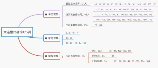 单位聚集性:冷库确诊21例,食品公司确诊48例 据健康时报不完全统计,官方公布的流调数据显示,截止12日24时,庄河市首站定点冷库目前已有21名冷库员工、1名冷库基建工人以及多名员工家属确诊。 据悉,大连此前也曾有冷链工作人员感染新冠病毒的案例。自2020年初疫情以来,健康时报不完全统计,大连先后出现5次新冠疫情,其中3次涉及冷链企业,包括2020年7月、2020年12月,及本轮2021年11月。据11月4日官方通报,本轮大连第一例确诊患者是一名52岁的男子,系庄河市首站定点冷库员工。 另外,河市某食品公司有48名员工确诊,流调显示,多名员工此前一直居住在单位宿舍。庄河市大学城先后有8名食堂员工确诊,庄河某餐馆有2名帮厨确诊。 学校聚集性:大学城累计确诊45例 在近两日新增确诊病例中,共有45例病例涉及大学城,多数为大学生。