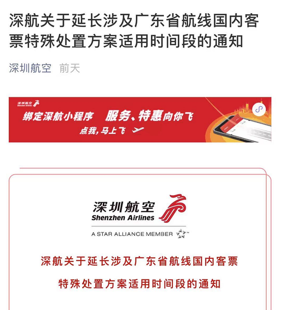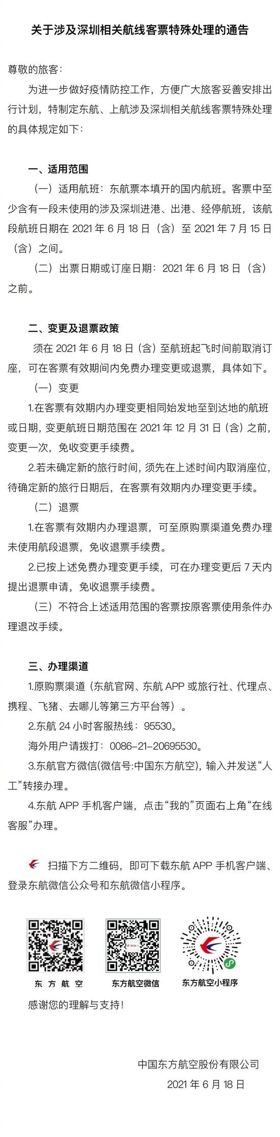 多家航空公司最新通知! 海南航空: 深圳进出港旅客,这些情况可免费退票 据海南航空消息—— 根据深圳市最新防疫要求,发布疫情防控期间深圳进出港旅客乘机提示及海南航空、大新华航空涉及深圳进出港国内航班票务处理规定 具体内容如下 *向下滑动查看全文* 一、深圳进出港旅客乘机提示 1。 深圳宝安国际机场近期航班情况变动较大,请旅客去往机场前提前查询航班情况,如遇航班变动,请及时调整您的出行计划。 2。 旅客可在深圳宝安国际机场候机楼内自助设备办理乘机手续,尽量减少携带托运行李,持电子登机牌或身份证即可通过安检、自行登机,从而有效减少排队等候时间与人员聚集情况。 3。 深圳宝安国际机场T3航站楼国内贵宾休息室1厅、2厅以及贵宾车接送服务自2021年6月18日开始暂停使用,恢复时间另行通知。 二、海南航空、大新华航空涉及深圳进出港国内航班票务处理规定 1 适用范围 1.1 适用出票日期:2021年6月18日(含)之前1.2 适用航班日期:2021年6月14日(含)至2021年7月15日(含)1.3 适用航班:由海南航空(HU)、大新华航空(CN)实际承运的涉及深圳进出港国内航班和海南航空(HU)、大新华航空(CN)为市场方涉及深圳进出港国内代码共享航班。 2 客票处理方案 2.1 在客票有效期内办理退票手续 2.1.1 如您在航班离站前已取消客票订座记录,可至原购票渠道办理免费退票业务,不收取退票费。 2.1.2 如您在航班离站前未取消客票订座记录,按照原客票使用条件办理退票业务。 2.1.3 如您在我司官网购买的客票,请在官网点击“其他原因”提交退票申请。 2.2 在客票有效期内办理变更手续 2.2.1 如您在航班离站前已取消客票订座记录,可免费变更至2021年7月15日(含)之前同航线、同服务等级航班一次(如您的客票涉及跨服务等级变更,可免收变更手续费,但需补齐票款之间的差额);如客票按照以上原则办理过客票变更后再次提出客票变更或申请退票,在客票有效期内按照变更后的客票使用条件办理。 2.2.2 如您在航班离站前未取消客票订座记录,将依据原客票适用条件办理变更业务。 2.2.3 办理免费变更业务地点:您通过海南航空各直属售票处,海南航空呼叫中心、海南航空官网(含官网APP)及官网OTA旗舰店购买的客票可至原购票渠道办理;您通过其他渠道购买的客票或您购票渠道无法办理免费变更业务时,可在海南航空各直属售票处或海南航空呼叫中心办理。 2.2.4 如您需变更航程或变更承运人,建议您将原客票办理退票后另购新票。 2.3 已购买随心飞产品客票的旅客,如符合本方案免费退票、变更条款的,须在原出票渠道自助办理非自愿退票,并注明疫情原因影响,经后台人员审核符合则予以通过。 本方案自2021年6月18日起生效。 请您在出行前务必确认本人符合出行要求,及时了解出发地和目的地的防疫政策,做好出行安排。感谢您的理解与支持!