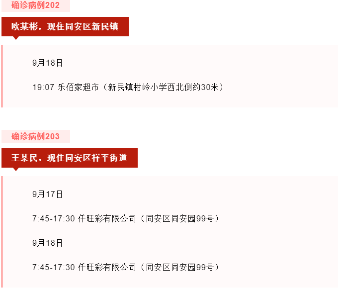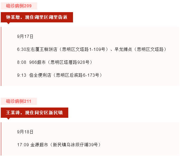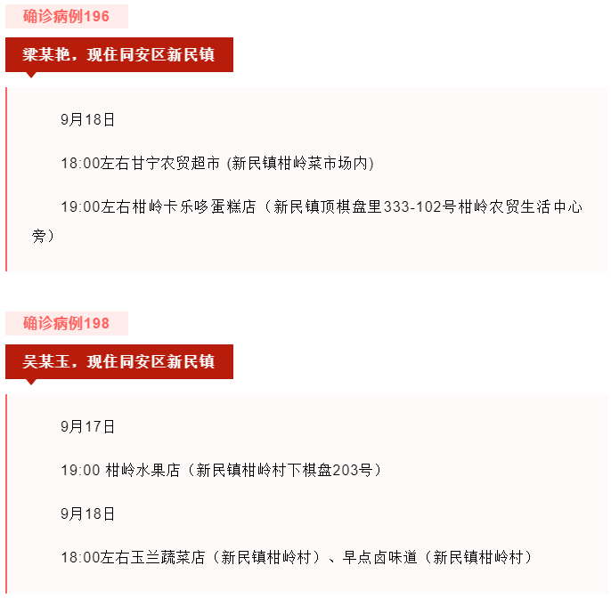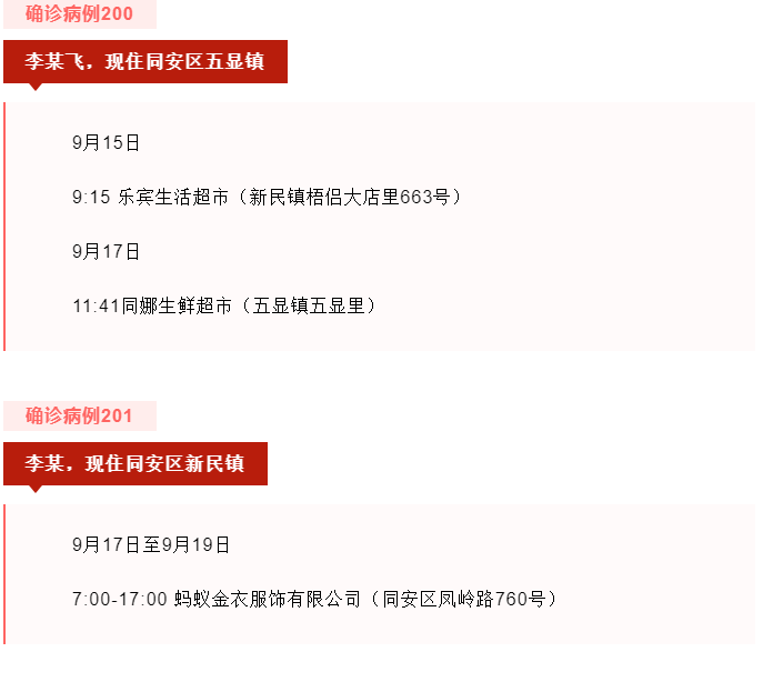 原标题:同安区发布疫情防控第19号、20号、21号通告! 来源:同安发布 厦门市同安区 应对新冠肺炎疫情工作指挥部 关于主动配合全员核酸检测的通告(〔2021〕第19号) 当前正值疫情防控的关键时期,为确保我区全员核酸检测不漏一人,做到早发现、早报告、早诊断、早隔离、早治疗,有效阻断疫情的传播和蔓延,保障广大人民群众身体健康和生命安全,坚决打赢疫情防控的人民战争。现通告如下: 一、疫情防控是全社会的共同责任,广大市民朋友要严格遵守疫情防控法律法规和市区两级疫情防控相关措施,主动履行防疫责任和社会义务。凡应检未检,造成疫情传播的应当承担相应法律责任! 二、各村(居)要严格落实出入证制度,对没有特殊原因未落实全员核酸检测的,禁止通行。发现未落实全员核酸检测人员的,应及时上报所在村(居),并由所在村(居)强制进行核酸检测。 三、鼓励各级各类组织和广大市民朋友举报辖区内本轮疫情以来从未进行核酸检测人员,举报信息经所在镇(街)核实后,给予每人1000元的奖励。 四、举报人应如实提供举报人和被举报人的基本身份信息,相关部门将严格保密。对恶意举报、诬陷他人、骗取奖励等行为,依法追究法律责任。 举报电话: 大同街道:0592—7026244 祥平街道:0592—7369258 洪塘镇:0592—7255313 五显镇:0592—7300944 汀溪镇:0592—7155798 莲花镇:0592—7050096 新民镇:0592—7021117 西柯镇:0592—7110880 本通告自发布之日起施行。 厦门市同安区 应对新冠肺炎疫情工作指挥部 2021年9月24日 厦门市同安区 应对新冠肺炎疫情工作指挥部 〔2021〕第20号通告 根据厦门市疫情防控指挥部统一部署,为及时有效发现和控制传染源,阻断疫情传播,决定2021年9月24日(周五)9:00-16:00开展重点区域全员新冠病毒核酸检测。有关事项通告如下: 一、此次核酸检测的区域范围划定为:1。祥平街道行政区域、新民镇行政区域;2。除祥平街道、新民镇外的封控区及周边相关区域。 请以上区域全体人员严格按照村(居)通知时间要求准时主动进行核酸检测。对于行动不便人员,村(居)将组织上门采样,确保全员覆盖、不漏一人。 二、凡应检未检,经查实的由公安机关依法打击,造成疫情传播的由相关部门追究法律责任。 三、核酸检测期间,请全体人员务必做好个人防护,佩戴好口罩,保持一米线距离,不扎堆、不聚集,并提前扫码预登记,关注“同安发布”公众号或听从村(居)安排扫描二维码,为本人及家人进行预登记。 厦门市同安区 应对新冠肺炎疫情工作指挥部 2021年9月24日 厦门市同安区 应对新冠肺炎疫情工作指挥部 关于严厉打击疫情防控期间违法犯罪行为的通告 (〔2021〕第21号) 为全力做好我区新冠肺炎疫情防控工作,保障人民群众生命财产安全,根据《中华人民共和国刑法》《中华人民共和国治安管理处罚法》《中华人民共和国传染病防治法》《中华人民共和国突发事件应对法》等法律法规以及同安区应对新冠肺炎疫情工作指挥部相关通告,相关执法部门对以下行为予以严厉打击: 一、拒不执行同安区应对新冠肺炎疫情工作指挥部发布的通告,未自觉接受新冠病毒核酸检测,导致疫情传播或者有传播严重危险的。 二、疫情中、高风险地区或者患有、疑似患有新冠肺炎的人员拒绝接受检疫、隔离或治疗的,以及与新冠肺炎患者或疑似患者接触而拒不接受随访、医学观察的。 三、在有关场所不配合体温检测、身份核查登记,以及居民离家外出进入公共场所不佩戴口罩、不听劝导,引发场所秩序混乱的。 四、违反疫情交通管制规定,不听劝阻、强行通行,或者强行冲闯公安机关设置的警戒带、警戒区的。 五、明知已感染或可能感染新冠病毒而故意进入公共场所或者隐瞒情况与他人接触,或者在疫情防控工作人员了解询问时故意隐瞒相关情况,导致疫情传播或者有传播严重危险的。 六、利用疫情实施诈骗、敲诈勒索、非法拘禁等行为的,或者哄抬物价、囤积居奇、牟取暴利等严重扰乱市场秩序,或者盗窃、诈骗、哄抢、抢夺、损毁、侵占、挪用疫情防控救援物资的。 七、生产、销售伪劣防治防护产品、物资,或者用于防治新冠肺炎的假药、劣药和不符合标准的医疗器械、医用卫生材料,或者违反国家规定处置医疗废物或者其他有害物质、严重污染环境的。