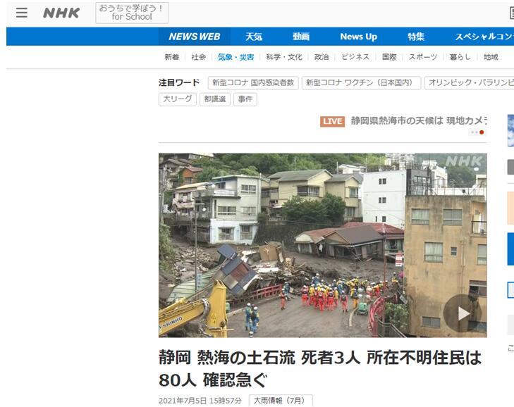 [时事新闻] 日媒:日本静冈县泥石流灾害已致3人死亡,仍有80人下落不明 |