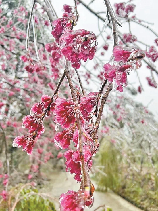 2月20日一早,记者走进南雄鸦子寨森林康养基地。山峦、茅草以及苍松翠柏,都被冰雪笼罩,显得晶莹剔透。细细看去,如珠帘玉盘,似玉树琼花,造就了“树树叠凇花,松柏绽银菊”的冬日美景。 当地相关部门提醒,冰雪风景虽好,但因部分进山道路陆续结冰,且山区初春常有浓雾,能见度低,请过往车辆与市民游客听从现场值守人员指挥,在确保安全的前提下有序通行。 冷空气抵达韶关市新丰县时,与绵绵春雨一起,把当地高海拔山区变成一个冰雪世界。在黄磜镇的岭南红叶世界,盛放的粉红色樱花披上了晶莹的“水晶装”,分外妖娆。沙田镇金青村风力发电场,强劲的寒流使得水汽在这里凝成漫山遍野的雾凇和冰挂,一片雪白,伴以流动的云海,宛若仙境。 “各位学生家长:鉴于云岩冰冻天气路面结冰严重,经请示市教育局同意,我校研究暂定周一周二(2月21-22日)学生停课两天,周三是否复课另行通知。”2月20日上午,韶关乐昌市云岩镇中心小学的学生家长们陆续收到来自学校的停课通知。 据悉,此前乐昌市教育部门已向各学校发出通知,提醒各学校高度关注目前寒潮、阴雨带来的冰冻和路面湿滑引发的安全隐患,结合实际情况做好预案,确保学生平安。目前云岩镇中学、庆云镇中心学校、白石镇中心学校等六所学校暂决定2月21日、22日停课两天,23日视情况决定是否恢复上课。