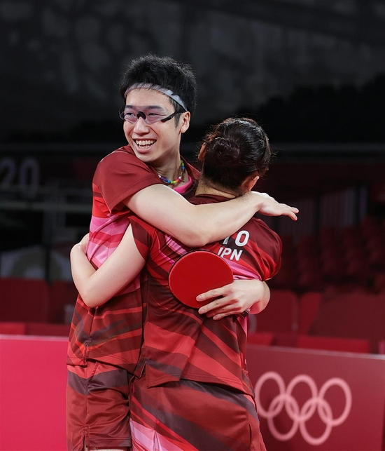 布置成一片喜庆红色的东京体育馆,并没有给中国乒乓球队带来好运。随着世界排名第一的中国组合许昕/刘诗雯爆冷被东道主组合水谷隼/伊藤美诚逆转击败,这对经验丰富的“昕雯联播”组合无缘奥运会历史上的第一枚混合双打项目的金牌。 这边厢,夺冠的伊藤美诚用乒乓球拍不断扇风,做出一副满头大汗的样子,任由日本摄影记者拍照;那边厢,落败的许昕举起满满一大瓶矿泉水,咕咚咕咚一饮而尽,仿佛要用水冲掉内心的郁闷。 好在,颁奖仪式上的许昕和刘诗雯已经调整好了思绪。他们互相给对方挂起银牌——这也是奥运历史上第一块乒乓球混双项目的银牌。32岁的许昕、31岁的刘诗雯相视一笑,这对老将组合在东京体育馆已拼尽全力,足以缅怀过去五年的坚持和付出。