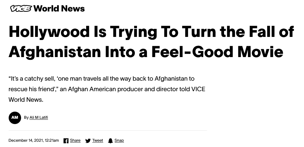 据美媒Vice新闻网14日报道,阿富汗裔美国制片人兼导演阿里·俾路支(Ali Baluch)表示,如今好莱坞又开始试图将阿富汗撤退拍成一部“美国人感觉良好”的电影,“美国人想要一部关于从野蛮人手中拯救棕色人种的让人感觉良好的电影。”