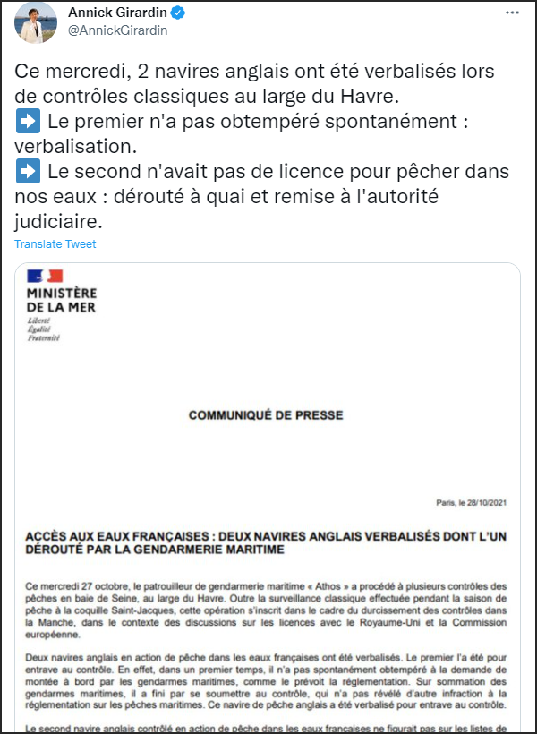 代表英格兰渔民的全国渔民组织联合会(NFFO)的巴里·迪斯(Barrie Deas)表示,执法行动可能是“正常的”,但法国政府的威胁“非常令人担忧”。 他建议,法国派更多渔船到英国海域捕鱼,数量比在法国海域捕鱼的英国渔船多。此外他表示英法之间“针锋相对”的关系是“无益的”。 经BBC核实,被法国扣押的船名为Cornelis Gert Jan,主要进出汉普郡的肖勒姆港(Shoreham),由苏格兰麦克达夫贝类公司(MacDuff Shellfish)运营。 该公司表示,其捕捞活动“完全合法”,这艘船在被当局扣留时,正在法国海域“合法捕捞扇贝”。 该公司表示,将在一切法律诉讼中为自己辩护,该船只是英法渔权争端的“另一枚棋子”,公司敦促英国政府“捍卫英国渔船的权利”。 苏格兰民族党(SNP)的环境发言人黛德·布洛克(Deidre Brock)将在下议院提出一个紧急问题。她将询问环境大臣乔治·尤斯蒂斯(George Eustice)“是否会发表声明,阐述英国如何与法国官员合作,以缓和贸易争端。” 据路透社最新消息,英首相约翰逊尚未对渔船被法国扣留做出任何回应。 英脱欧大臣弗罗斯特称,政府正在寻求法国对情况做“紧急说明”,并将“考虑在这种情况下下一步需要采取哪些行动”。