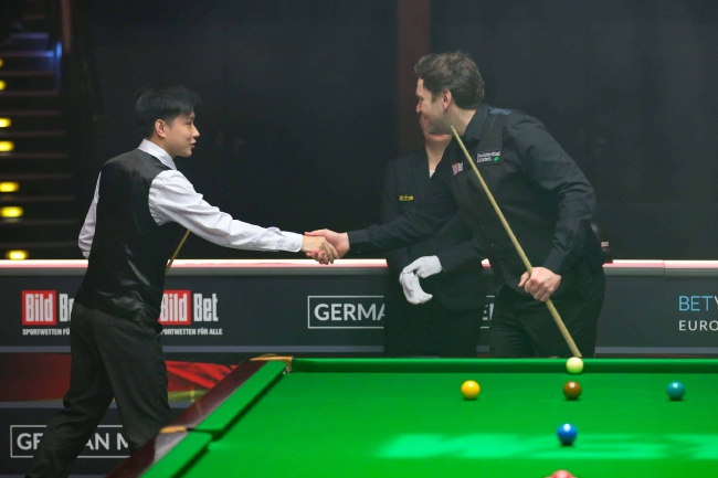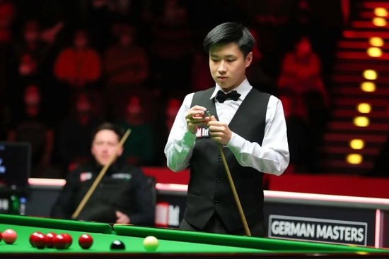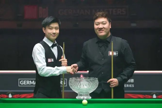 第10局堪称一波三折,艾伦率先得分,颜丙涛在随后一波有望迫近比分的连续得分中主动承认犯规,赢得了对手的尊重和全场观众的掌声。清彩球阶段,颜丙涛凭借多杆凶狠进攻,和两杆防守迫使艾伦三度犯规,实现超分。决胜时刻,颜丙涛虽然没有勾进蓝球,让局面重回延分,艾伦则由于压力两次打丢粉球。最终,颜丙涛拼进远台粉球,6-4击败艾伦。 德国大师赛决赛将在两位中国选手 —— 颜丙涛和赵心童之间展开,这是历史上第三次出现排名赛决赛‘中国德比’。此前仅有的两次排名赛决赛‘中国德比’均诞生于2013年,丁俊晖先后在上海大师赛和国际锦标赛决赛中击败肖国栋和傅家俊。2011年,丁俊晖和傅家俊还曾在大师赛决赛中上演过‘中国德比’。2013,梁文博和吕昊天还在小型排名赛 APTC3 的决赛中完成过会师。 29日(半决赛)赛果 赵心童 6-3 R。沃顿 9-74(74),45-75,78(78)-14,51-66(66),63-(60),90(65)-31,83-0,94(72)-10,100(100)-0 M。艾伦 VS 颜丙涛 103(75)-7,35-77,58-50,5-116(116),0-72(53),59-72,104(104)-0,49-58,67-16,52-71 30日(决赛)赛程 21:00/27:00,赵心童 VS 颜丙涛