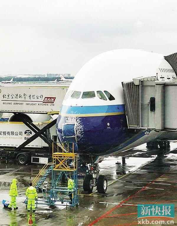 受北京雷雨天气影响,5月26日上午,南航CZ3101广州-北京航班在降落过程中遭冰雹,挡风玻璃出现裂痕。经机组按手册程序处置,飞机于昨日上午11时48分安全降落北京首都机场,机上人员皆平安。由于涉事的飞机为“巨无霸”空客A380,这一事件引起了高度关注。飞机降落后,地面人员用胶带等材料对受损的雷达罩进行部分遮挡。