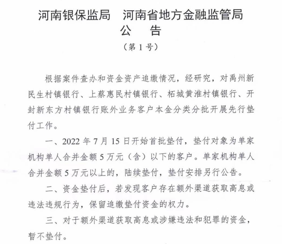 何为“账外业务”? 除了分批垫付外,“账外业务”这一表述也引起市场关注。根据监管部门发布的处置方案,违规业务被划定为“账外业务”。 如何理解“账外业务”?第一财经采访获悉,此次相关资金定性为“账外业务”,并不是按照资金是否进入村镇银行来判断,而是按照资金是否被银行真实统计,并报送监管系统进行区分。 金融监管研究院院长孙海波撰文指出,此前账外一般是指表外业务不做台账,而此次则稍微有差异。兑付方案将违规业务定性为“账外业务”用词非常讲究,完美规避了到底哪些是入了资产负债表哪些没有入资产负债表这个头疼的问题。 7月10日深夜,“平安许昌”微信公众号发布警情通报称,2011年以来,以犯罪嫌疑人吕奕为首的犯罪团伙通过河南新财富集团等公司,以关联持股、交叉持股、增资扩股、操控银行高管等手段,实际控制禹州新民生等几家村镇银行,利用第三方互联网金融平台和该犯罪团伙设立的君正智达科技有限公司开发的自营平台及一批资金掮客进行揽储和推销金融产品,以虚构贷款等方式非法转移资金,专门设立宸钰信息技术有限公司删改数据、屏蔽瞒报。 孙海波认为,从警方通报可以看出,主要资产端出口是“虚构贷款”,这说明部分资金还是进入了村镇银行的资产负债表,当然进入资产负债表未必是为每个储户设立的存款账户,也可能是以同业资金或者其他形式计入负债端,但即便是入了资产负债表,同样被定义为账外,因为肯定也没有如实向当地监管报送数据,内部也没有做储户的明细存款账户。此外,部分资金大概率没有进入资产负债表,资金出口其实也不需要虚构贷款。资金清算进入代理行清算行账户,不入资产负债表,内部不做存款入账,直接转出关联方账户。这部分更加符合传统“账外”业务定义。 业内专家表示,从前期相关部门发布的信息和警情通报来看,河南村镇银行风险事件涉及面很广、案情非常复杂。必须经过严格的调查取证,才能查清事实、还原真相,从而确定账外业务客户资金处理政策。