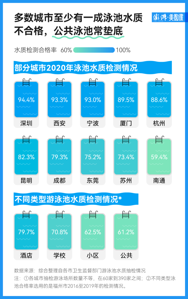 “泳池礼仪”值得尊重 既然公共游泳池的问题这么多,是不是就不能去游泳了呢?也不是。 首先,挑选一个正规的游泳池很重要。合格的游泳池会采取定期消毒杀菌、定时补充新水等一系列手段来保证水质,这会大大地减少细菌、病毒带来的健康危害。 什么样的游泳池才算正规呢? 建议大家,一看卫生许可证,有卫生许可证的场馆才正规;二看禁泳提示,游泳场馆会设有禁泳警示标识以保护泳客健康及安全;三看游泳池水质,池水清澈透亮,池底清晰可见是起码的保证;四看水质公示,游泳池场馆通常都会在醒目位置公示水质检测结果,不妨留意一下这个公示上的检测时间再下水。 此外,公共卫生还是需要大家来共同维护,这时“泳池礼仪”也非常值得每个人尊重: 一是确保自己身体状况良好才去游泳。遵照禁泳提示,患有甲型、戊型肝炎等肠道传染病,重症沙眼、急性出血性结膜炎(红眼病)、性病等传染病,中耳炎、精神病等疾病及酗酒者,是严禁进入泳池的,如果知道自己有相关问题,还是自觉一些,不要去游泳池里凑热闹了; 二是记得自带泳衣泳裤和泳镜。为了避免交叉感染,游泳场所禁止出租泳衣泳裤。如果发现有出租的情况,可向当地卫生健康部门举报; 三,泳前最好先淋浴,洗掉身上的污垢、汗液、化妆品等,减少向泳池中带入污染物; 四,进入游泳池前必须过一下浸脚池,通常浸脚池水都含有较高浓度消毒剂,能有效减少脚部带入的细菌、真菌。如果发现浸脚池没有水或能被绕过,请向当地卫生健康部门举报; 五,提醒大家都来做一位“高素质泳客”,不要在泳池内搓澡、大小便,要共同维护泳池水质卫生。(更多新闻资讯,请关注羊城派 pai.ycwb.com)
