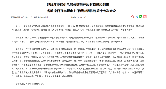 四川为我国水电大省,去年水电生产稳居全国首位。不过,今年60年一遇的高温天气导致用电负荷持续攀升,叠加流域干旱导致水电发电能力大幅下降、外省煤入川运力不足等因素影响,四川面临严峻的能源保供形势。