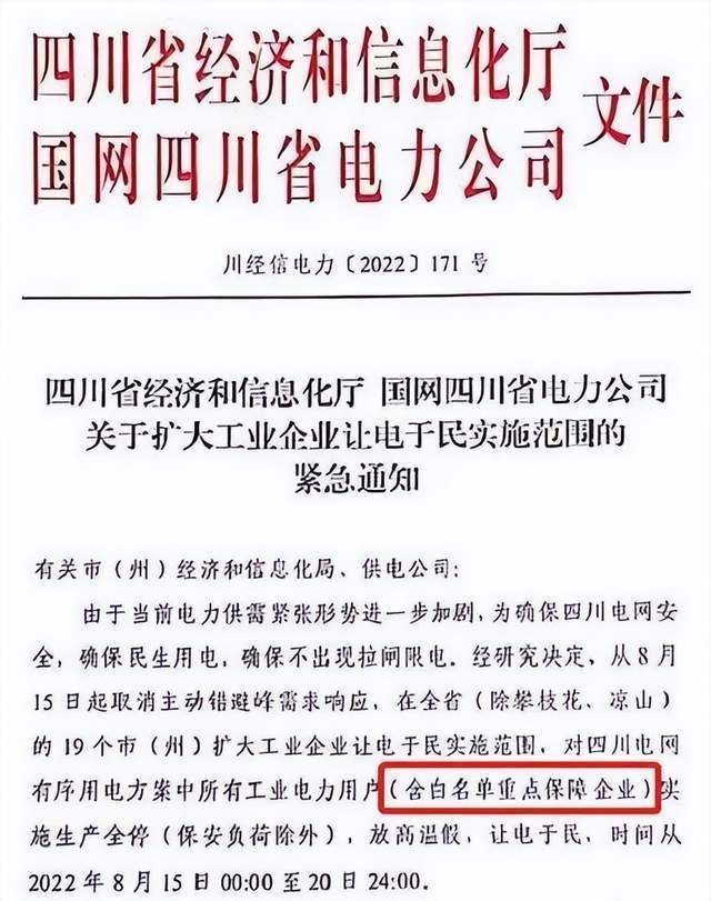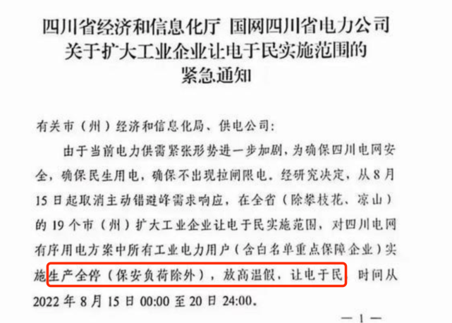 次日,四川再次召开电力保供调度会,全省(除攀枝花、凉山)的19个市(州)扩大工业企业让电于民实施范围,对四川电网有序用电方案中所有工业电力用户(含白名单重点保障企业)实施生产全停(保安负荷除外),此次停产措施将持续至8月20日。