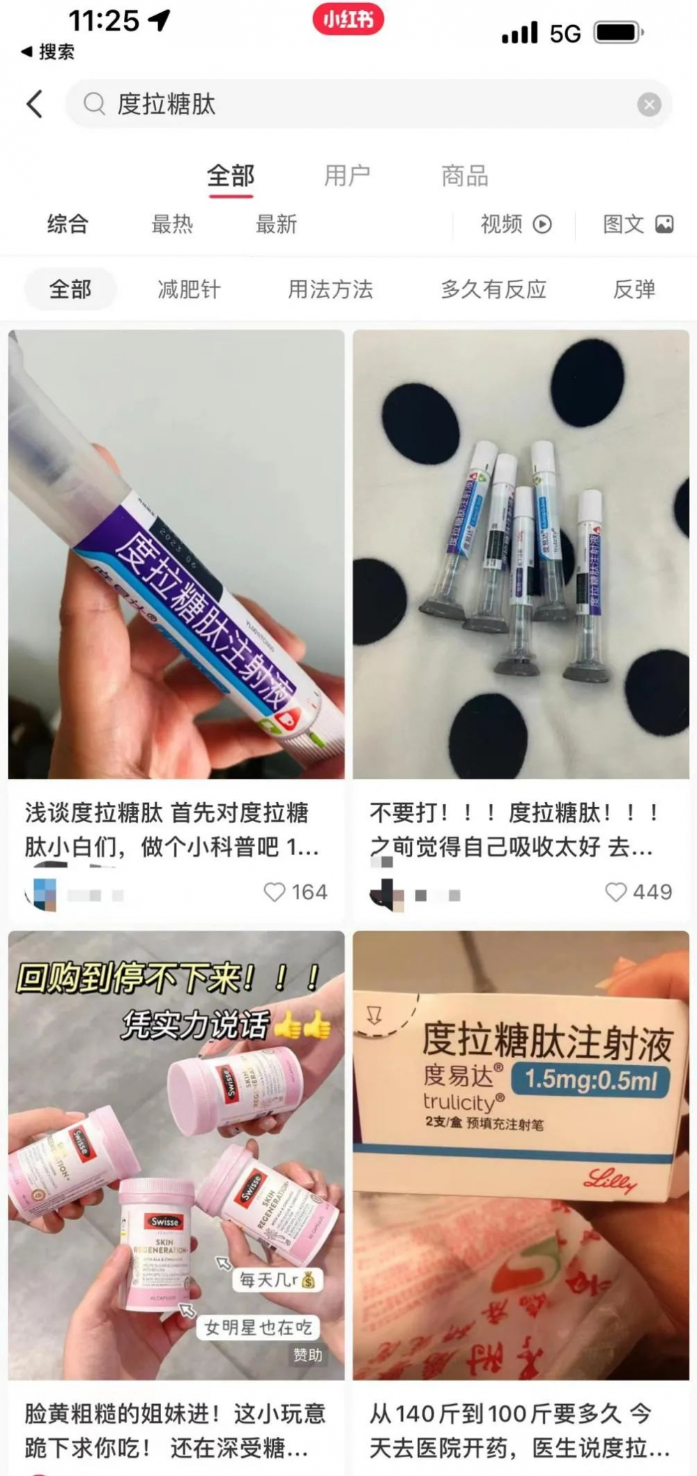 “我从进入青春期以后就饱受身材肥胖的痛苦,运动、节食、针灸,几乎市面上所有减肥方法我都试过,屡战屡败!”陈菲菲一提到减肥,就非常焦虑。 最近三年,她的体重以每年10公斤的速度飙升,今年27岁身高165的她,体重已经超过了100公斤。 “朝阳医院的内分泌医生对我说这样发展下去情况非常严重,第一种方案就是切胃,我觉得太恐怖了根本不敢想。医生经过检查发现虽然我现在没有糖尿病,但是我爸爸家族有糖尿病遗传史,就建议我打度拉糖肽。这个针打下去太难受了,闻到肉味儿就恶心呕吐,把胃吐空了,根本吃不下东西。但是,半个月我就瘦了8斤!尽管难受,我还是要继续打!”陈菲菲告诉《中国经济周刊》记者。 但是陈菲菲没想到的是,在打完3针以后,当她再去朝阳医院开药时,价格为149元/支的度拉糖肽居然断货了,要等通知才能拿到。 与陈菲菲经过医院途径获得药物不同的是,Frank是通过抖音和小红书发现这种“神药”的。 Frank的肥胖被医生判定为家族遗传,他从小就很胖,食欲特别好长肉特别快。 “胖子的绝望常人无法理解,从我妻子父母到身边朋友都像唐僧一样随时随地说你别吃了,你太胖了!没人会顾及我的情绪,所有人都说是为我好。我去过减肥夏令营,把市面上能吃的用于减肥的药都吃过了,包括被禁的西布曲明,还有左旋肉碱和一些成分不明的减肥茶,目前被药监局批准的奥利司他、二甲双胍等都试过。”Frank提起减肥,非常心塞和痛苦。“没人能理解我吃了含有西布曲明的药会心慌、口渴、乏力,有的减肥茶我喝了就会拉肚子,更可怕的是吃奥利司他我还会排油,甚至排泄可能会喷出来。二甲双胍对我又完全没作用!” Frank说。