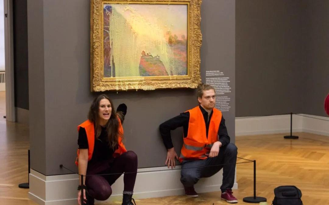 此次被泼土豆泥的画作《干草堆》,是莫奈这一系列中最晚创作的一幅,市场价格高达1.1亿美元。 而此次行动的发起和实施者是一个名为“最后一代”的青年激进环保组织,他们的成员身着醒目的橙色背心,一边高呼反对化石燃料、反对碳排放的口号,一边向画作投掷土豆泥,不仅如此,他们还用一种黏合剂将自己粘贴在墙壁上。 这并不是该组织的第一次行动。其2021年曾在柏林组织绝食抗议,2022年初则故意选择早晚高峰,在最繁忙的高速公路路段制造大堵车。 针对此次“《干草堆》事件”,他们在推特上声称,这样做的目的,是“牺牲一幅画以提醒人们正视碳排放正杀死人类和环境的事实”,并扬言将“再接再厉”。 实际上,“最后一代”只是近来不断袭击艺术作品的欧洲激进环保团体中“小儿科”。严格来说,他们是另一个更有名气同类团体——英国“Just Stop Oil(停止石油)”组织的“模仿秀”版。 “Just Stop Oil(停止石油)”组织的真正建立,是在今年年初。当时,英国政府迫于能源紧张和通胀压力,宣布扩大北海石油天然气生产,一举激怒了这些青年激进环保分子,他们建立全新组织,试图通过自称的所谓“直接行动”向公众传递自己的“正义呼声”。 4月起,他们公开“锁定”英国埃塞克斯、赫特福德、南安普顿、伯明翰等地10处“关键石油设施”,针对其周边道路、桥梁、码头、油轮、油罐车和其他基础设施进行堵塞、骚扰和涂鸦。进入秋季,他们认定“效果不显著”,转而将矛头对准艺术品。 10月14日,两名女性向伦敦国家美术馆陈列的荷兰画家梵高名作《向日葵》投掷番茄汤,并将自己粘贴在墙壁上,不断高呼“什么更有价值,是艺术品还是生命?艺术品比食物更有价值么?比正义更有价值么?你们是更关心保护一幅画还是保护我们的星球和人民”,以及“关注生活成本危机、关注数百万饥寒交迫家庭”等口号。 这是该组织迄今针对艺术品的最激进行为。3个月前,他们曾在同一美术馆陈列的康斯特布尔《干草韦恩》画作(系早期高水平临摹画)、伦敦皇家艺术学院的达芬奇《最后的晚餐》早期复制品上喷涂黏合剂,但如今,他们显然觉得不如“来真的”效果好。