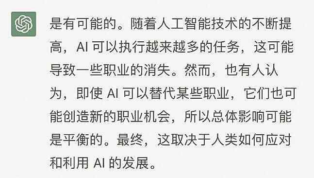 不过,当有人问ChatGPT:AI到底能不能代替人类?ChatGPT的回答是:“是有可能的。随着人工智能技术的不断提高,AI可以执行越来越多的任务,这可能导致一些职业的消失。然而,也有人认为,即使AI可以替代某些职业,它们也可能创造新的职业机会,所以总体影响可能是平衡的。最终,这取决于人类如何应对和利用AI的发展。”