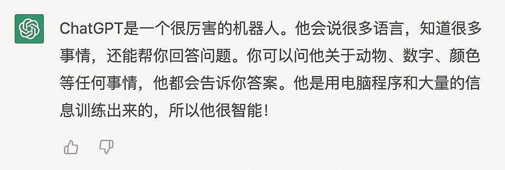 对于这个问题,已经有人问过ChatGPT,他自己的回答是:“ChatGPT是一个很厉害的机器人,他会说很多语言,知道很多事情,还能帮你回答问题。你可以问他关于动物、数字、颜色等任何事情,他都会告诉你答案。他是用电脑程序和大量的信息训练出来的,所以他很智能!”它还会说:“我之所以叫ChatGPT,是因为我是一款基于人工智能的文本生成系统,可用于自动生成文本内容。我使用机器学习模型来理解输入文本,并生成有意义的输出文本。”