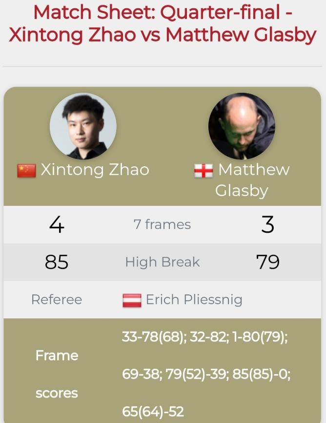 斯诺克2站比赛同时进行,中国球员再次成为焦点!不到8小时,中国军团豪取3连胜,苏格兰公开赛决赛上演中国德比,雷佩凡会师吴宜泽争冠,这是排名赛决赛历史上首次00后对决;赵心童4-1打停平齐斯直通欧巡赛Q-TOUR第5站奥地利站16强,继续冲击职业资格。 今晨0点49分,苏格兰公开赛首场半决赛结束,21岁的吴宜泽面对武汉公开赛冠军肖国栋敢打敢拼,2-4落后连赢4局完成逆转,全场打出5记单杆制胜。这是吴宜泽本赛季第2次直通决赛,此前他在英格兰公开赛争冠战7-9不敌罗伯逊丢冠,这一次能破荒吗? 凌晨1点34分,欧洲Q-TOUR第5站奥地利站头号种子、中国名将赵心童速战速决,4-1打停卢克平齐斯,连轰单杆99分、86分和50分,轻松入围16强。前2站Q-TOUR站,赵心童打出2杆147连夺2冠,只要本站赛事登顶,就能确保下赛季重返WST! 今早8点32分,雷佩凡打进锁定胜局的粉球,2-5落后完成极限逆转,反杀世界第5 马克艾伦,生涯首进排名赛决赛,创造奇迹!不到8小时,中国军团就豪取3连胜,打赢2场外战。雷佩凡和吴宜泽无论谁夺冠,都将在本赛季实现破荒,赵心童有望再次征战职业赛,中国斯诺克的春天来了!