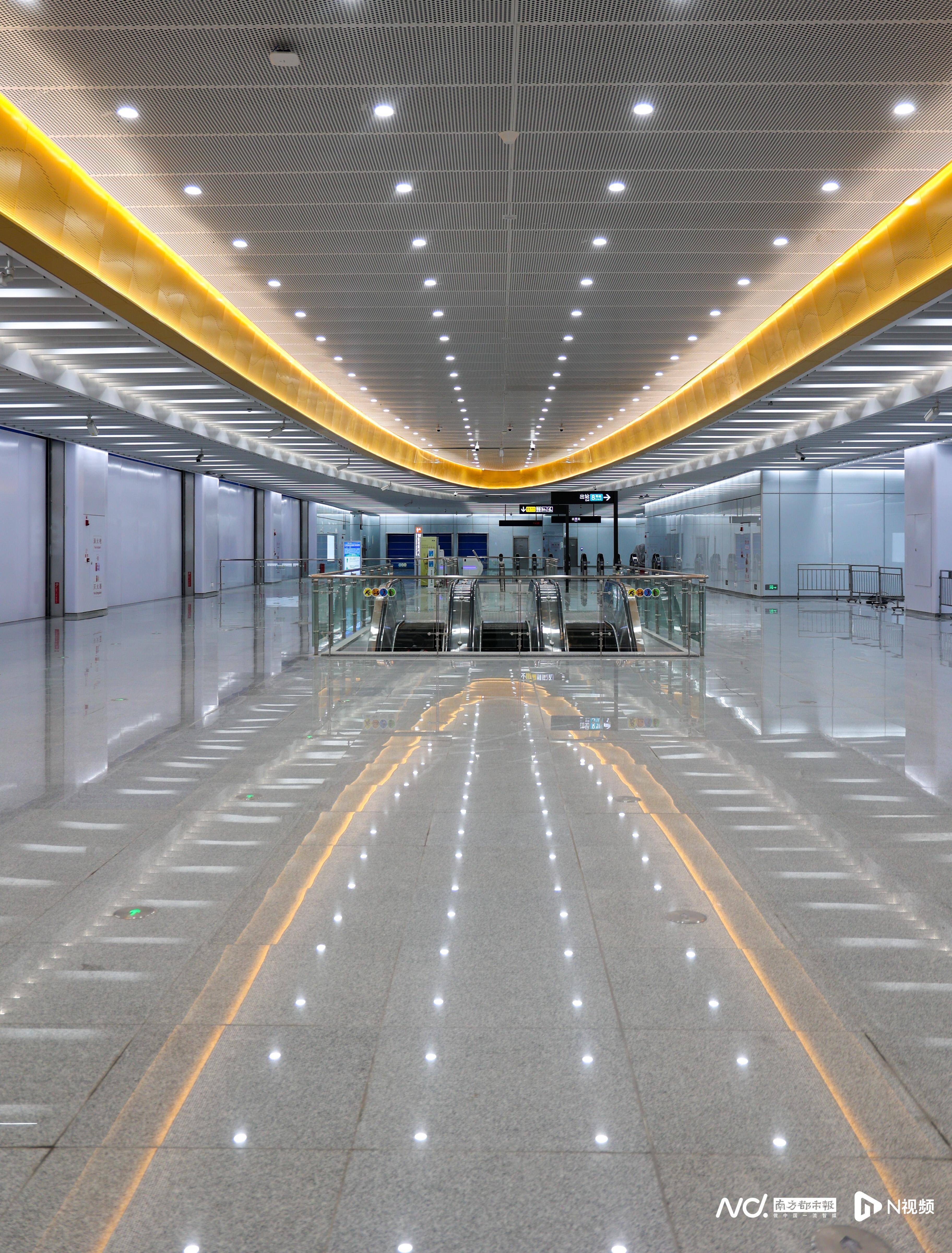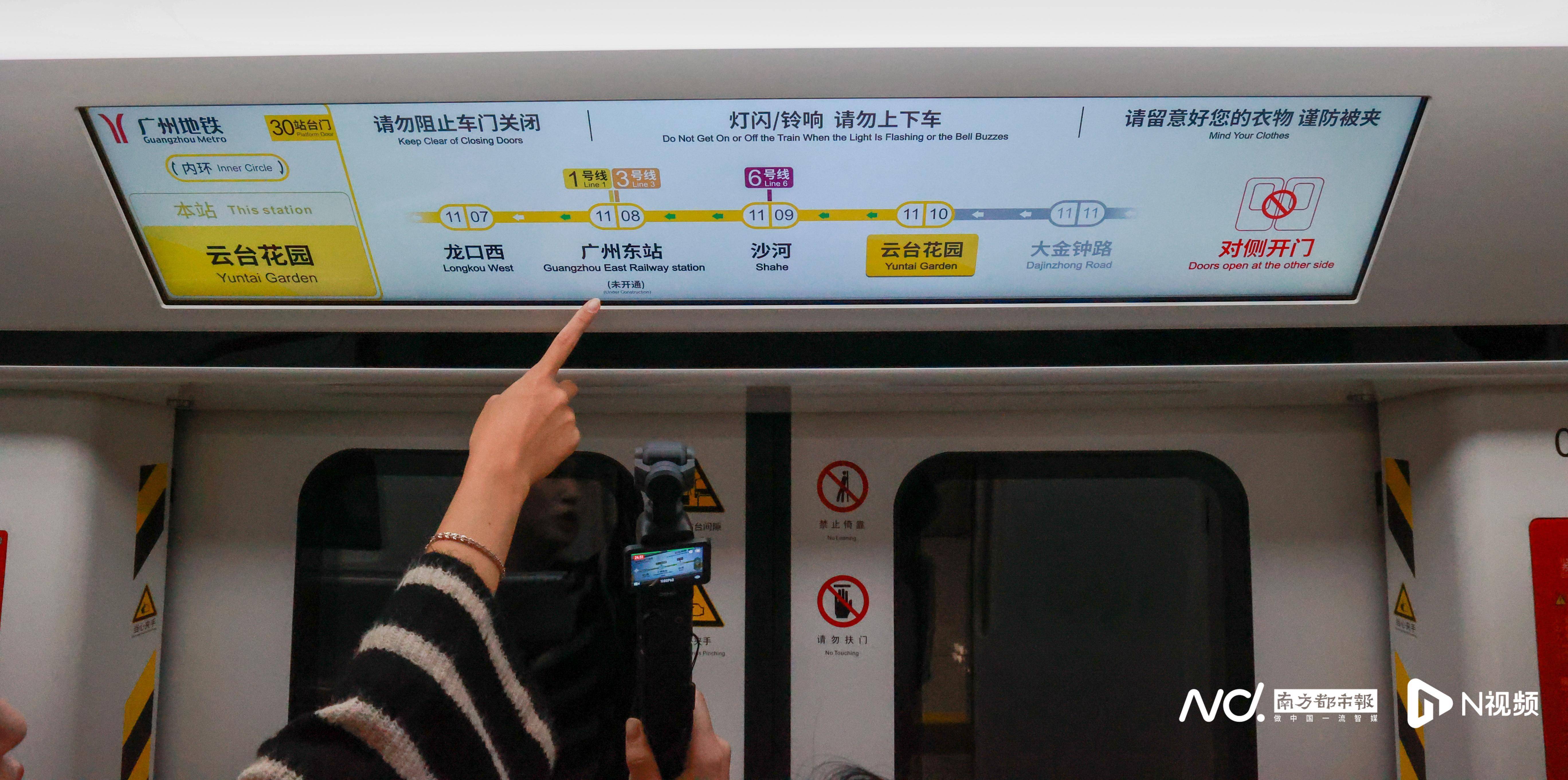 举个例子来说,南都记者在云台花园站看到,在站台导向标识上,分别显示“内环、外环”方向,内环方向的下一站是“沙河”,并提示途经重点车站是华师、天河公园。 而外环方向的下一站是“大金钟路”,并提示途经重点车站是彩虹桥、中山八。 在站台门导向标识方面,盖板上显示线路为外环方向时,云台花园站对应的半环站是江泰路站(红圈标记),如果目的地是在江泰路站及以内的车站,也就是导向上的“深色站名”(车站名字显示颜色为深色),推荐乘坐外环方向列车会更加快捷,内环方向同理。 为了方便乘客搭乘十一号线,广州地铁向乘客推荐了环线乘车"三看法"。一看站台扶梯、楼梯正前方吊顶导向灯箱,寻找"下站""内、外环""途经站"等信息。二看站台柱面、墙面或站台门上的环线图,寻找乘客目的地站。结合"半环站",乘客只需确认"目的地站"在导向指引上是"深色"显示,那就代表乘客正位于地铁推荐的乘车方向;如果"目的地站"是"灰显",则建议乘客到另一侧站台候车。三看站台地铁电视或听站台广播,乘客可以再次确认自己的乘车方向是否无误。 十一号线开通运营后,将采用内外环单一交路行车,全线单程运行时间约75分钟。工作日高峰时段上线28列车,行车间隔5分22秒,低峰时段上线20列车,行车间隔7分30秒;周末高峰时段上线列车24列,行车间隔6分15秒。