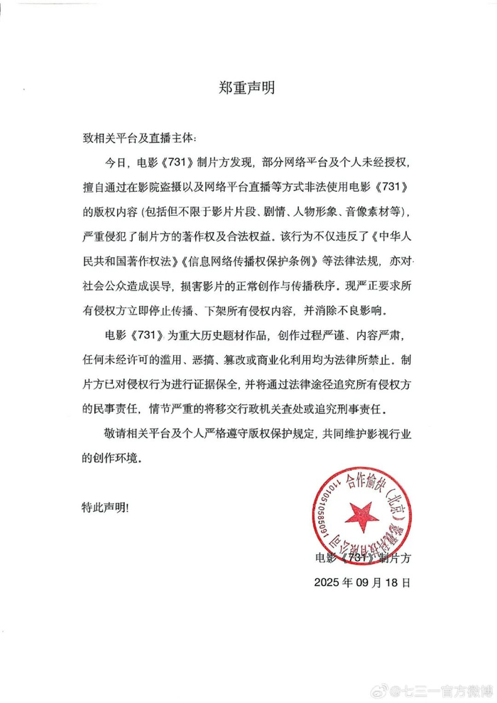 《731》是沈阳人目前“最关注”的电影 当日9时,记者来到了位于中街的沈阳光陆电影院,此时放映大厅内坐满了等待观影的人群。观众崔惠贤说:“我们从小就听过这段历史,但在大银幕上,还没有看到过这段历史,我对这部电影非常期待。” 光陆电影院经理郭明说:“自从《731》电影定档后,观影期待指数就不断增加。根据专业数据统计,该片目前是沈阳观众最想看的电影。为此,今天特意设立了‘警钟长鸣’专场,共有188人成为首批观众,他们都是个人购票。要知道,这一天是工作日,并非节假日,能有这么大的观影期待度和热情,足以说明观众对这部电影的重视。” 据记者了解,沈阳多家影院都推出了“警钟长鸣”专场,都得到沈阳观众的热捧,虽然是工作日,但上座率非常高。玖伍影城的负责人说:“我们影城的‘警钟长鸣’专场上座率达到了90%,很多市民都是全家一起来看的。” 《731》伴随着“防空警报”开始放映 当日9时18分,沈阳全城拉响防空警报,光陆电影院内的放映大厅灯光暗下,《731》电影开始放映。 电影采用多线叙事,将受害者们的经历浓缩为三组典型人物:劳工反抗者(姜武饰)、良知觉醒的日本军医(王志文饰)、儿童见证者(林子烨饰)。这三个人的觉醒之路,构成了影片的情感核心。 导演赵林山采用“冷色调+暖光”的对比手法,在表现暴行时使用冷蓝色调,在表现人性光辉时使用暖黄色调,形成强烈的视觉冲击。这种“冷暖交织”的视觉语言,既增强了影片的戏剧张力,又深化了主题表达。 借助影院内银幕上的光线,记者看到身旁的观众不时咬着牙、流着泪、攥着拳头,这种情况直到电影结束。