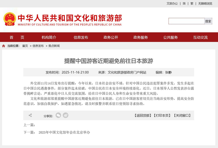 《日经亚洲》指出,受高市早苗引发的争议事件影响,日本的航空公司和零售商股票11月17日出现大幅下跌。11月18日,日本东京股市日经225种股票平均价格指数开盘后更是持续走低,一度跌超3%。截至北京时间13点15分,日经225指数报48915.24,跌超1400点。市场分析普遍认为,本轮下跌,主要受科技股领跌及中日关系恶化拖累。 据日本国家旅游局的统计,今年1月至9月,中国赴日游客人数约为749万人次,较去年同期增长超过40%,是各国或地区中人数最多的。 另据日本观光厅的统计,今年7月至9月,中国游客在日本的消费额位居外国游客之首,占游客总消费额2.131万亿日元的27.7%,达5901亿日元。这一数字较去年同期增长了26.1%,去年同期为4999亿日元。 该机构称,购物占中国游客旅游消费的30%以上。在日本百货商店,奢侈品牌包袋、珠宝和化妆品等高价商品一直深受游客欢迎。 百货公司运营商高岛屋报告称,今年3月至8月,中国顾客的销售额占其免税销售额的50%以上。在东京热门购物区银座经营百货商店的松屋百货也表示,中国顾客的消费占其免税销售额的60%以上。松屋百货表示:“现阶段我们无法预测形势,需要密切关注事态发展。” 截至今年8月,迅销集团在中国经营着约900家优衣库门店。该集团发言人也表示:“我们目前正在密切关注事态发展。” 据报道,截至11月18日,日本航空公司(JAL)表示,尚未观察到日中航线整体机票预订量出现显著变化,也没有减少或停飞航班的计划。 而在中国,某北京旅行社的内部人士告诉澎湃新闻:“我周末问的时候还没有太多退订,今天又问了问退订还是比较多的。”