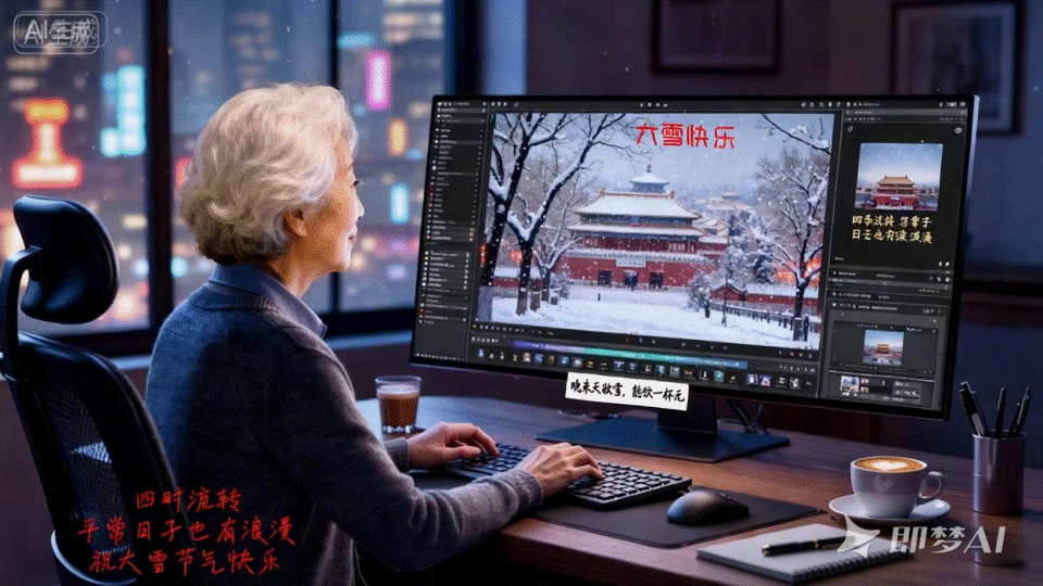 1. **画面核心** - 主图聚焦「老年人的冬日小确幸」:窗边一张藤椅,椅上搭着厚毛毯,旁边小桌放着一杯热茶(冒着热气的动态效果);窗外是漫天大雪,院里的腊梅开得正好,一只猫蜷在窗台上打盹。 - 动态效果:雪花簌簌落下,茶杯的热气缓缓上升,猫偶尔眨眨眼睛。 - 色调:**暖黄+雪白**,室内暖光和室外冷雪形成对比,温馨治愈。