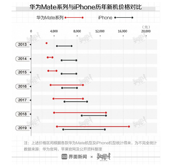 售价跟着配置走,香不香看配置 香不香除了与对手比,更要与自己比。从2013年华为Mate手机发布以来,将Mate系列打造成为华为高端手机的决心就已经显现出来了。而Mate系列的售价也从当年的2688元起一路涨到目前的5000元水平。 来自界面新闻×数据线整理的图可以看到,与华为Mate同时期的iPhone 5S价格为5288元起步,而直到目前苹果旗舰机的起步价格仍然没有超过这个范围。 2013年,华为Mate手机发布,售价为2688元,同时期发布的iPhone 5S国行版起步价格为5288元,顶配售价为6888元。品牌之间的鸿沟还是非常明显。 2014年,华为发布Mate 7系列手机,起售价为2999元,顶配价格3699元。同时期发布的iPhone 6系列国行版起步价格为5288元,顶配价格为7788元。 2015年,华为发布Mate 8系列手机,起售价为3199元,顶配价格为4399元。同时期发布的iPhone 6S系列国行版起步价格为5288元,顶配价格为7788元。这时候华为Mate系列成为了国内唯一取得不错销量的单价4000元左右手机。 2016年,华为发布Mate 9系列手机,起售价为3399元,顶配价格为8999元。同时期发布的iPhone 7系列国行版起步价格为6399元,顶配价格为7988元。 2017年,华为发布Mate 10系列手机,起售价为3899元,顶配价格为8999元。同时期发布的iPhone 8系列国行版起步价格为5888元,顶配价格为7988元。当年苹果还发布了iPhone X这款极具创新的手机,而iPhone X的起售价也直接来到了8688元,顶配更是高达9688元。 2018年,华为发布Mate 20系列手机,起售价为3999元,顶配价格为12999元。同时期发布的iPhone XR国行版起步价格为6499元,顶配的iPhone XS Max价格为12799元。 2019年,华为发布Mate 30系列手机,起售价为3999元,顶配价格为12999元。同时期发布的iPhone 11系列国行版起步价格为5499元,顶配价格为12699元。 2020年,华为发布Mate 40系列手机,起售价为4999元,顶配价格为13999元。同时期发布的iPhone 12系列国行版起步价格为5499元,顶配价格为11899元。 在2016年以前,华为Mate系列保时捷版本尚未发布之时,华为与苹果的售价有明显的差距,但在Mate 9保时捷版发布后,华为旗舰机顶配价格实现了对苹果的反超。而在Mate系列的入门版起售价方面,华为也从当初的2688元涨到今年的4999元,不过除了售价的上涨以外,显而易见的是手机设计和性能方面也在不断提高,支持着Mate系列一步一步站稳了高端的脚步。
