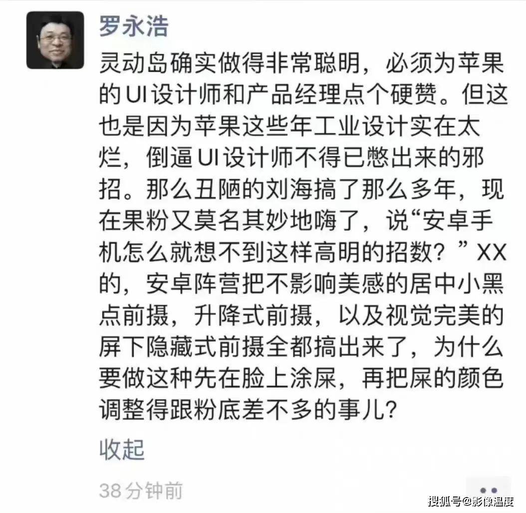 罗永浩随即补充道:有部分果粉称,安卓手机怎么就想不到,如此高明的招数?罗永浩此次发布动态,显然对于网络部分网友,在苹果与安卓手机的对比上,故意踩低的行为强力回怼。称安卓阵营吧不影响美感的,居中小黑点前摄、升降式前摄、以及视觉完美的,屏下隐藏式前摄全都搞出来了。为什么要做这种,先在脸上涂屎,再把屎颜色调得跟粉底差不多的事儿?
