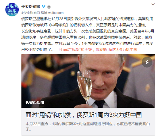 原标题:面对“甩锅”和挑拨,俄罗斯1周内3次力挺中国 俄罗斯卫星通讯社12月28日援引俄外交部发言人扎哈罗娃的话报道称,美国利用俄罗斯作为破坏《中导条约》的便利切入点,真正原因是对中国实力的担忧。 长安街知事注意到,这并非俄方头一次点破美国退约的真实意图。美国自今年8月退约以来,多次想把中国拉入军控谈判,也多次试图挑拨中俄关系。对此,俄方每一次都力挺中国。本月22日至今,1周内俄罗斯3次对这些问题进行回应,态度已经不能更明白了。