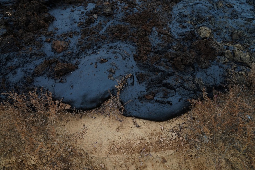 李根山用一截树干插进铁锹挖开的污泥里,一下插进去1米多深,带出来的都是黏腻恶臭像沥青状的黑色固体,刮去污泥,铁锹上沾满一层油膜。“表面的壳原来特别硬,用铁锹挖都挖不动,前两天下了雨,软了些,才能挖得动,这十几年了,每次下雨都往下渗,这地下水肯定被污染了。” 李根山说。
