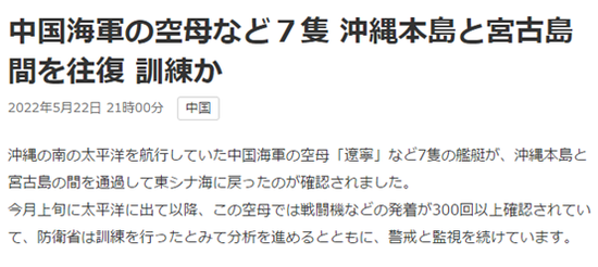 综合幕僚监部的消息称,日本海上自卫队当地时间21日上午10时许至下午5时许期间,在宫古岛以东约170千米至约220千米海域处发现中国航母辽宁舰及其他6艘中国舰艇。这7艘中国海军舰艇随后穿过宫古海峡向西北方向行驶,驶向东海。消息称,日本方面曾于5月1日在东海发现这7艘舰艇,当时这些舰艇穿过宫古海峡南下。 消息还称,日本自卫队舰艇、飞机对辽宁舰等7艘中国舰艇实施了警戒监视、情报收集任务。 近期,日本紧盯中国航母辽宁舰在西太海域舰载机起降训练,日媒纷纷炒作称,5月初起,自卫队共观测到辽宁舰舰载战斗机等起降超300次,日本防相岸信夫连番就辽宁舰表态称关切。 对于日本对辽宁舰如此高级别的关注,一位匿名军事专家18日对《环球时报》记者表示,最近一段时间,日本方面像祥林嫂一样喋喋不休炒作中国海军航母正常的海上训练纯属无病呻吟,使用“最接近”“密切关注”等字眼也是在故弄玄虚。中日是邻居,即使中国海军舰艇在本国近海训练也离日本不远,这本来是极其正常的现象,“远离日本一万多公里的美国派出航母在西太训练,并驻扎日本,为什么日本对此反而觉得正常?对中国海军航母的正常训练行动大肆炒作,只能说明日本的心态不正常。” 这位军事专家指出,日本连续炒作辽宁舰的正常训练活动,其意图有两方面,一是要为日本发展航母和潜艇等进攻性力量制造借口,二是要掩盖美日舰艇长年累月在中国近海进行侦察巡逻、军演等炫耀武力的行动。“作为二战侵略国和战败国,日本发展航母、潜艇等进攻性武器装备和登陆作战等进攻性武力的动向已经引起亚太国家对日本军国主义复活的担忧。”