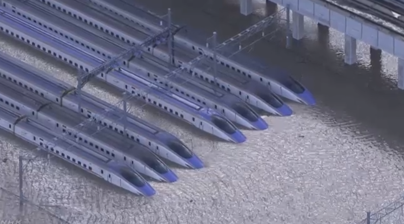 JR东日本称,台风“海贝思”引发的暴雨导致千曲川洪水泛滥,位于长野市赤沼的车辆中心有新干线车辆被水淹。 另据日本共同通讯社报道,“海贝思”登陆日本后,日本气象厅已向东京、群马、埼玉、神奈川、山梨、長野、静冈等地发出了大雨特别警报。警报级别相当于大雨和洪水警戒级别中最高的5级。