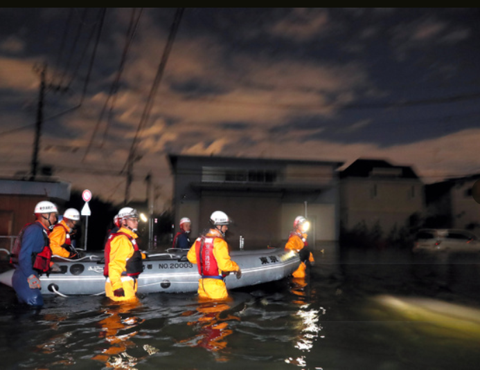 目前台风带来的暴风强降雨天气造成许多河流都已达到泛滥水位。13日早上6时左右,通过监控观测到长野县穗保的千曲川一部分堤坝疑似决堤,河水蔓延至住宅区。当地有老人院处于孤立状态,消防部门已开始用小船展开救援。 强台风“海贝思”肆虐日本,有新干线车辆被淹。(图源:NKH)