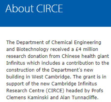 5. 剑桥大学的合作 我又一次离开了祖国,回到了我的象牙塔。 过了不久,父亲的那三个月的“疗程”也就快到期了,我再一次拨通了妹妹的电话。 这一次,妹妹从电话里给我带来的是两个消息。一是父亲决定再吃两个月的保健品,二是父亲去了辽宁营口,自费参观了那个保健品公司的生产基地。 前面的消息没有让我感到惊讶,但后面的那一点却完全出乎了我的意料,于是我直接拨通了父亲的电话。 “听说你去了辽宁了?”我问。 “是啊,和另外四个人一起去的,不用担心,挺安全。我们先去了营口的生产基地参观,然后还访问了一位抗癌明星。”父亲说。 “抗癌明星?”我不解地问。 “是啊,这个人本来是一位千万富翁,后来得了癌症,经过三十多次的化疗都没有用。后来听人建议服用了这个公司的产品,他身上的癌细胞居然消失了。从那以后,他不再做其它的生意了,把近千万的资产都投到保健品生意里,开了一家很大的专卖店。”父亲滔滔不绝地说。 “这是不可思议的事情,我不相信这个保健品能治疗癌症的。”我说。 “我刚开始也是半信半疑的,后来他亮出了原来的检查结果,的确是得过癌症的,后来消失了。那些医院里检查的结果都在,我亲眼看到的。当然我也觉得可能不仅仅是保健品的作用,应该以前的化疗也起到了一些作用,化疗和保健品结合到一起,才彻底把癌症给杀灭了。”父亲还是滔滔不绝,谈着他此行的收获。 “听妹妹说,你这个‘疗程’结束了后,还准备再吃两个月。”我转移了话题。 “是啊,店里的人说,我不能这样马上停,一下停下来身体可能还不习惯。所以建议我再维持一个月的‘治疗’剂量,然后再吃一个月的保健剂量。我觉得挺有道理,而且总共也就三千多块钱,我就把药拿了回来。”父亲说的坦然,丝毫没有注意到我的不满。 还没有等我说话,他又继续说:“那个生产基地真是大,而且生产流程很规范,仪器设备也很新。投入肯定不少,你想想,要是一个骗人的保健品公司,会舍得这样投入去建设生产基地吗?哦,对了,这个公司和国外的顶级大学还有合作呢,就是英国的剑桥大学。我把链接发给你看看。” 父亲发过来的的确是这个公司和剑桥大学合作建立的“剑桥infinitus研究中心”的信息。根据这个英文名字,我找到了它在剑桥大学网站上的官方页面[9]。这个“剑桥infinitus研究中心”是infinitus公司和剑桥大学化学工程及生物技术系在2015年9月合作建立的。 在这个网页上,清楚地写着这个研究所建立的过程:化学工程和生物技术系收到了中国健康产业巨头infinitus公司的四百万英镑的捐款。这笔捐款一部分用来建设系里的新楼建设,另一部分用来支持“剑桥infinitus研究中心”的研究。这个研究所的领导由Clemens Kaminski 教授和Alan Tunacliffe 教授担任。(图5) 图5 剑桥大学网站上关于“剑桥infinitus研究中心”的介绍截图 也就是说,是infinitus公司在2015年向剑桥大学化学工程和生物技术系捐了四百万英镑,然后成立了这个“剑桥infinitus研究中心”。在欧美,大学很愿意接受这些来自民间的捐款,用这种捐款成立的联合研究中心也不鲜见。关键是,它是否真的有科研合作和产出。 那么,这个成立了三年半的“剑桥infinitus研究中心”的科研成果如何呢? 我搜了一下以Cambridge Infinitus Research Centre为研究单位发表过的研究论文。结果只有两篇(图6),而且还都是若干个单位的其中之一。如果再以Cambridge Infinitus Research Center为单位搜索一下,还可以找到另外一篇。也就是说,三年多来这个研究中心只参与发表过三篇研究论文。具有讽刺意义的是,“剑桥infinitus研究中心”的两位领导科学家Clemens Kaminski和Alan Tunacliffe教授这些年都发表了不少论文,但他们只把其中一篇带上了“剑桥infinitus研究中心”名字。 图6 以“剑桥infinitus研究中心”为作者单位的研究论文 也就是说,原来人家根本没有把这个研究中心当回事。不过也对,本来也只是一笔来自民间的捐款而已。 我把这些信息反馈给父亲,告诉他这更像是一笔捐款,而不像是科学层面的合作。 父亲沉默良久,然后问我:“是不是可以这么认为,这笔捐款是为了拓展国外市场而打的广告?” 我回答说:“不是的,恰好相反,这更是面向国内用户而打的广告,因为外国人是不会买这种保健品的,可能极少数的华人除外。” “但不管怎么说吧,人家也是剑桥大学,是不会轻易和一般的企业合作的。再说,我相信的是‘疗效’,这些保健品的的确确在我身上起到了作用。”父亲又回到了“疗效”,谈起了他的血压。 “爸爸,你还记得在家乡火车站时我说的那种可能性吗,假设保健品里添加了降血压的西药,我说的是假设。”我谨慎地说。 “我都说过多少次了,中医治病和西医不一样,你满脑子都是西医,那是治标不治本的东西,而中医是通过调理来治本的。”父亲有些不耐烦地反驳说。 “那你怎么证明中医治本呢?”我继续问。 “这简单,我们店里的一些病人都停药几年了,三高再也没有复发过。要是西医行吗?西医一停药就复发了。”父亲说。 “那些店里的病人因为自己也在卖这个产品,有利益关系,所以我不能相信他们的话。我只相信在你身上发生的事情。”我说。 “好吧,我吃完这一个多月也就不吃了,到时候你就知道了。”父亲充满乐观地说。 趁着父亲的乐观,我建议说:“按照你的说法,西医治标,停药就复发;而中医治本,停