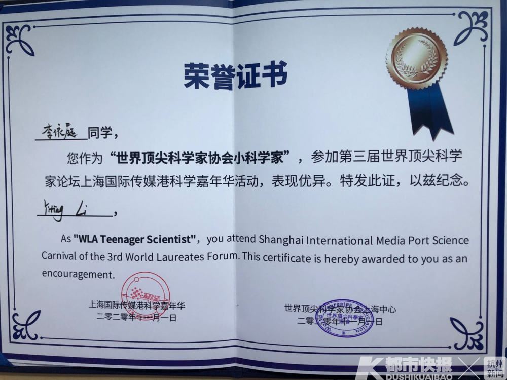 生命科学和文学是她的两大爱好 才华横溢的李依庭不仅在生命科学方面取得了优异的成绩,还是位不折不扣的文学少女。“我有两大爱好,一是生命科学,一是文学。”谈到自己的兴趣爱好,她眼中闪着耀眼的光芒。 在刚刚结束的第十四届浙江省少年文学之星征文比赛中,李依庭从众多参赛者中脱颖而出,获得“少年文学之星”称号,高中组只有三人入选。 初赛期间正值疫情,大家都要呆在家里,她就把逆流而上的医务人员作为主角,用了将近一个月的时间,创作了一部一万多字的现实主义题材话剧。她说:“我非常推崇的一个写作的观点是‘文章合为时而著’。” 凭借这部话剧,李依庭进入现场决赛。“高中组的题目是减法,我对希腊神话特别感兴趣,就结合自己之前阅读的一些神话,和我写的小说,以双线并进的形式,揉成了一篇两千多字的文章,非常有幸能获奖。” 这并不是李依庭第一次获将,从小学五年级开始,她先后四次获得“少年文学之星”称号。请她讲讲写作秘诀,她低调地表示:“平时学业比较忙,没有动力去创作一篇比较长的小说,征文比赛会限定一个范围,带着这些‘束缚’再去施展我的想法,对我来说,就是一种成长的契机。” 就像这次征文大赛,原本对话剧的写作要求并不了解的李依庭,阅读了大量的话题作品。《茶馆》、《雷雨》、《北京人》、《龙须沟》……通过阅读,她学到了话剧的创作形式、写作格式和内容精髓。 “二中也给了我一个非常好的进行文学创作的环境。学校里有很多与文学相关的社团,像话剧诗社、文学社等等,经常举办一些活动,让我们完全沉浸在文学的氛围里。”她特别提到。