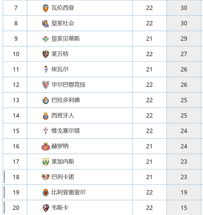 本赛季西甲的保级战确实很激烈。以目前积分榜的情况来看,除了韦斯卡和比利亚雷亚尔,还有至少9支球队在为保级而战。踢了21轮的贝蒂斯与同样踢了21轮的巴列卡诺之间只有6分差距。排名第7的瓦伦西亚与少赛一场排名第18的巴列卡诺也只有7分差距。 随着武磊的加盟,中国球迷也有了明显的支持球队,我们都希望西班牙人可以击败若干强劲的对手成功保级,下赛季武磊才能够继续征战西甲。 (斧荆)